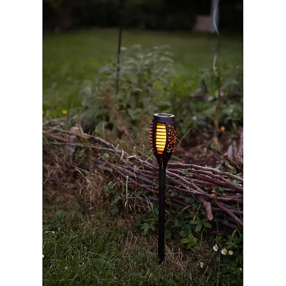 Lot de 6 Torches à énergie solaire – effet flamme naturelleCette référence existe également à l’unité, en lot de 2 et en lot de 4, voir les pages respectives.Matière : résine type PPNombre de Lumens : 3Durée maximum d’éclairage : 6 heuresInterrupteur on/offLED : 12 LED ambrée vacillante Batteries rechargeables : 1 x 200mAh Ni-Mh (2/3) AAADimensions produits : (voir le schéma technique parmi les images)H : 473,7 / 388,2 mm – Ø 73,55 mm