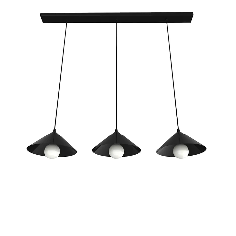 Chapeau Binario, au design moderne en forme de cône, est parfait pour illuminer vos pièces avec style et élégance. Fabriquée en métal de haute qualité, cette lampe garantit une finition spectaculaire et une longue durée de vie.La lampe est composée de 3 diffuseurs métalliques d’un diamètre de 25cm qui assurent un éclairage homogène et réparti.CARACTÉRISTIQUES TECHNIQUESDimensions : 69×6.5x120cmPuissance : 42 W maximumTension : 220-230 VCâble : le câble a une longueur maximale de 120 cm et est réglable vous permettant de régler facilement la hauteur de la lampe.UTILISATION : Profitant du charme des lampes de forme conique, Chapeau Binario est le choix idéal pour l’éclairage intérieur de la maison et s’adapte parfaitement à tout style de mobilier. Cette lampe est parfaite pour les salles à manger, les chambres, les cuisines, les bureaux, les salons, donnant à n’importe quel environnement une touche de classe et de raffinement.La douille E27 facilite le remplacement en cas de casse, assurant une gestion simple et pratique. Nous vous conseillons d’utiliser une ampoule à haute efficacité énergétique d’une luminosité d’environ 1500 lumens, idéale pour éclairer une surface d’environ 12 m2 en lumière directe.