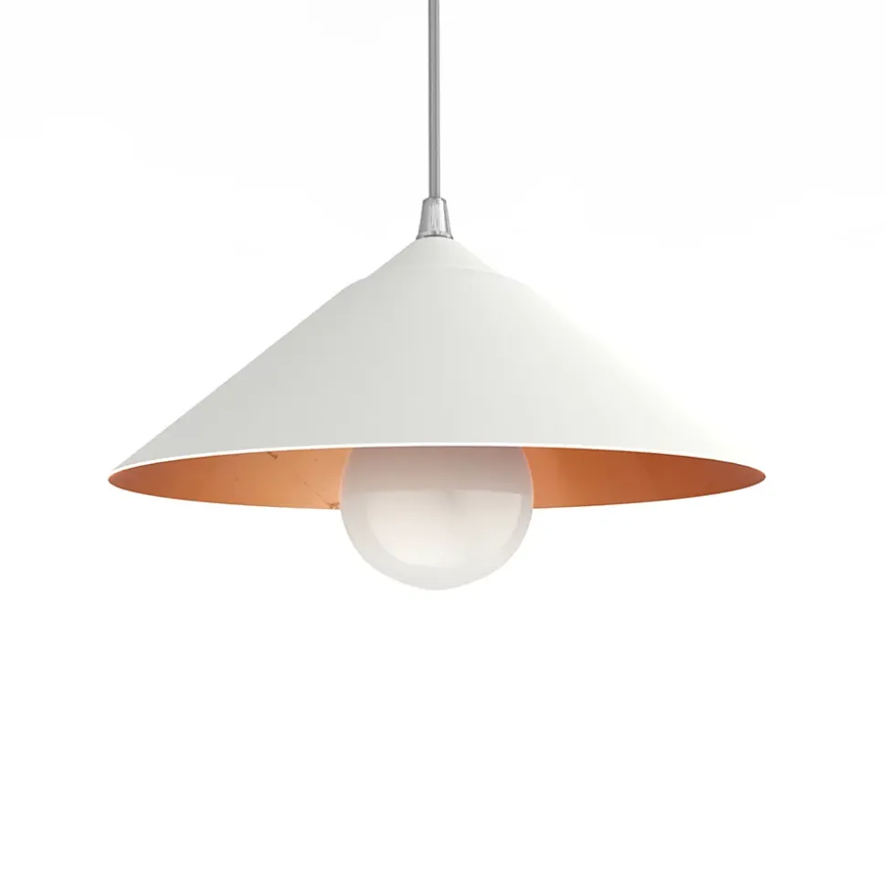 Chapeau est une lampe à suspension en métal peint et intérieur recouvert d’une feuille de métal appliquée à la main. Le produit attire le regard par la présentation du diffuseur conique, une forme classique et intemporelle. Existe en version diamètre 25cm et 40cm.