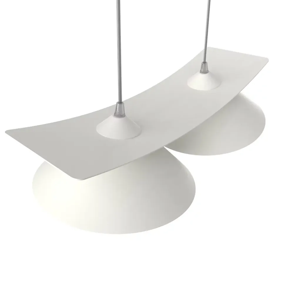 Miller est une suspension au look moderne et particulier. La plaque incurvée soutient les diffuseurs placés en dessous, restituant un effet de forme particulier qui caractérise le produit par rapport au reste. Le produit est entièrement peint avec de la poudre époxy et est équipé de douilles E27 et de câbles d’alimentation en PVC transparent. L’intérieur des diffuseurs est recouvert manuellement d’une feuille de métal.