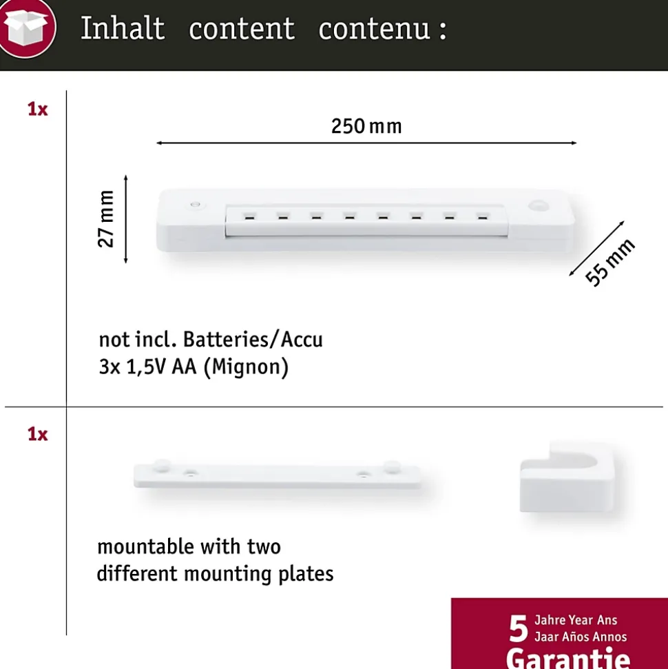Découvrez le luminaire LED Paulmann SmartLight, conçu spécialement pour les armoires et les espaces de rangement. Avec son détecteur de mouvement intégré, ce luminaire s’allume automatiquement à l’approche, offrant ainsi une luminosité optimale de 3000 K en blanc chaud. Sa puissance de 1.6 W garantit un éclairage efficace tout en étant économe en énergie. Adapté pour une installation facile, il peut être fixé avec des vis ou collé grâce à des patins auto-agrippants. Le luminaire est équipé d’un interrupteur marche/arrêt et d’un variateur d’intensité pour personnaliser votre éclairage selon vos besoins. Parfait pour la cuisine, le bureau ou l’atelier, il combine un design moderne et fonctionnel. Dimensions : 25 cm de long, 5.5 cm de large et 2.7 cm de haut. Inclus : luminaire, systèmes adhésifs et notice d’utilisation. Remarque : les piles (3x LR6/AA 1,5 V) ne sont pas fournies et doivent être achetées séparément.