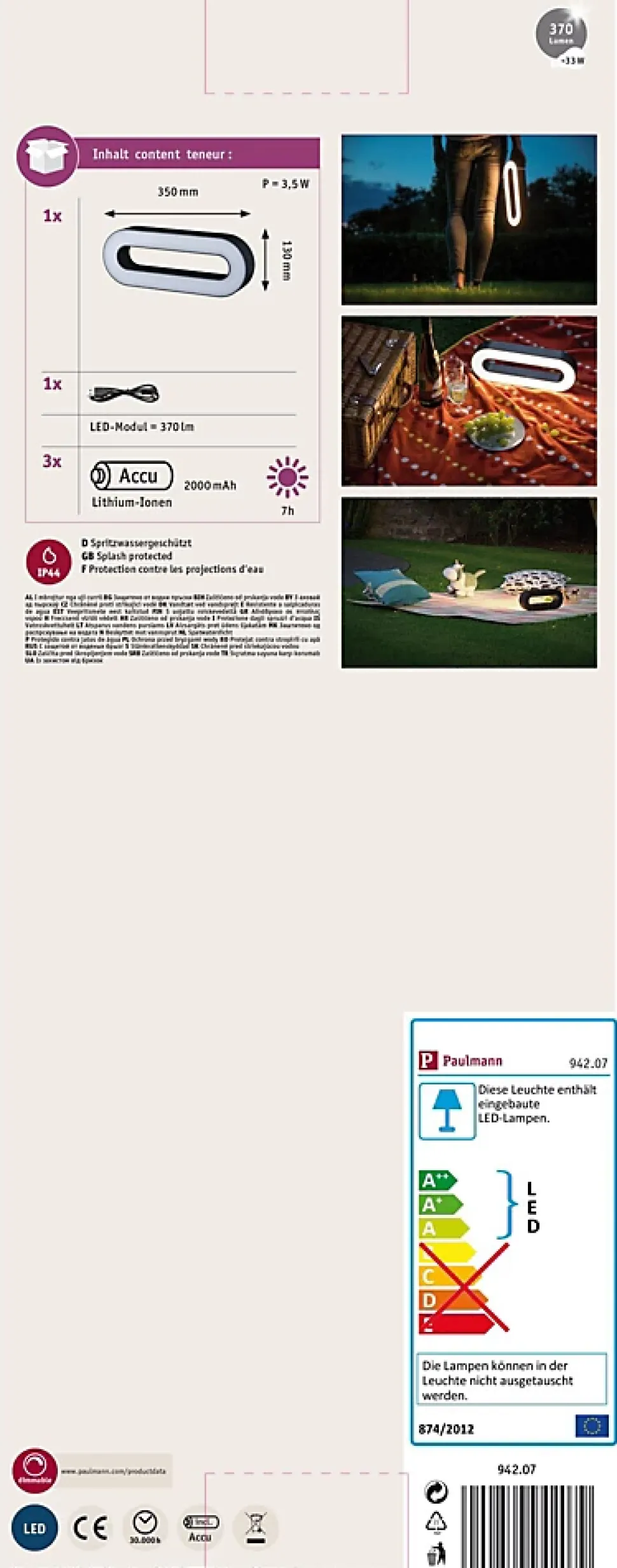 Luminaire d’extérieur mobile sur batterie|Utilisable n’importe où même sans prise électrique grâce au fonctionnement sur batterie|Avec port USB pour recharger la batterie|Fonctionnement possible sur station de recharge|Température de couleur: 3000K – Blanc chaud|IP44 – Protection contre les projections d’eau, y compris en extérieur|Intensité variable|Autonomie d’au jusqu’à 6 heures
