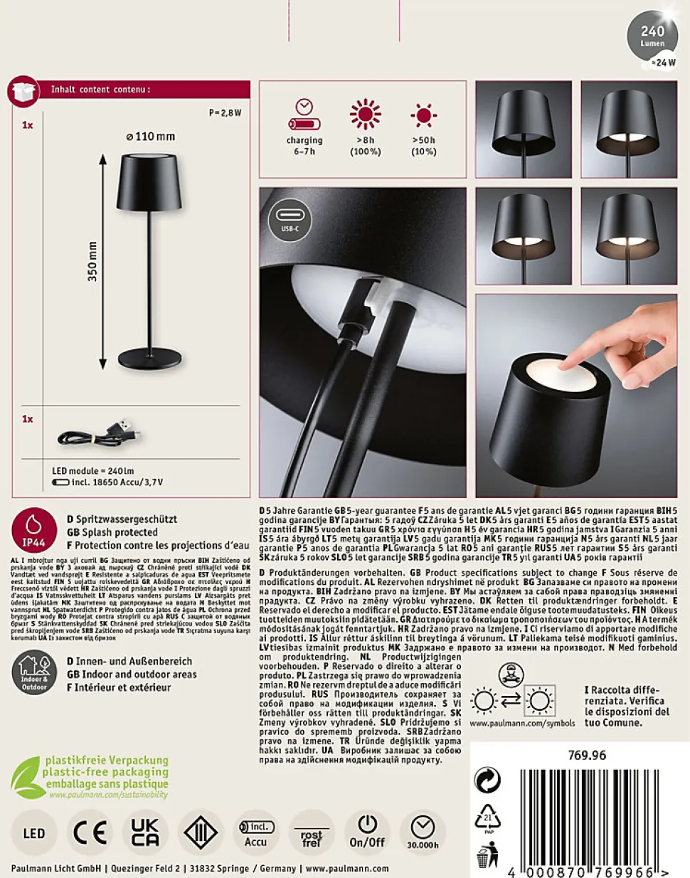 Intégration parfaite dans l’environnement grâce à la dimension compacte et le coloris intemporel du boîtier|Utilisable n’importe où même sans prise électrique grâce au fonctionnement sur batterie|Chargement simple de la batterie intégrée grâce à un câble USB|Température de couleur: 2700K – Blanc chaud|le type de protection: IP44 – convient pour locaux humides ou extérieur
