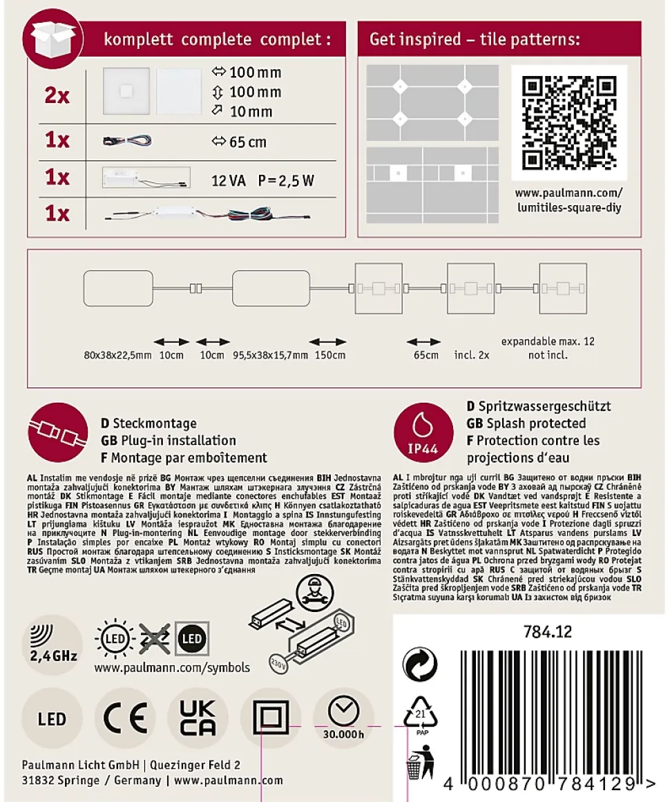 Le kit de base de carreaux Square LED LumiTiles 100x100mm efficaces avec une puissance de 2×0,8W est composé de deux carreaux, d’un câble de raccordement (longueur 60 cm), d’un transfo avec raccordement inclus ainsi que d’un contrôleur Zigbee 3.0 RGBW. Les carreaux LED avec fonction de changement de couleur Multicolor RGBW requièrent une profondeur d’encastrement minimale de seulement 10 mm. Ils s’intègrent sans problème entre des carreaux muraux standards et permet une commande facile depuis l’interrupteur lumineux. Ces deux modules lumineux se placent librement entre les joints de carrelage et sont reliés très simplement grâce au système de connexion Plug & Play. Il peuvent être raccordés par câble avec un espace de 65, 105 ou 205 cm. Avec les carreaux de carrelage innovants et lumineux, tout projet de carrelage devient fantastique ! Les modules d’éclairage donnent lieu à des accents lumineux décoratifs et étendus fermement intégrés aux carreaux de carrelage des cuisines et salles de bain. Grâce à son excellente flexibilité, à son montage aisé et à sa très longue durée de vie, le système LumiTiles Paulmann convient à tout type de projet.