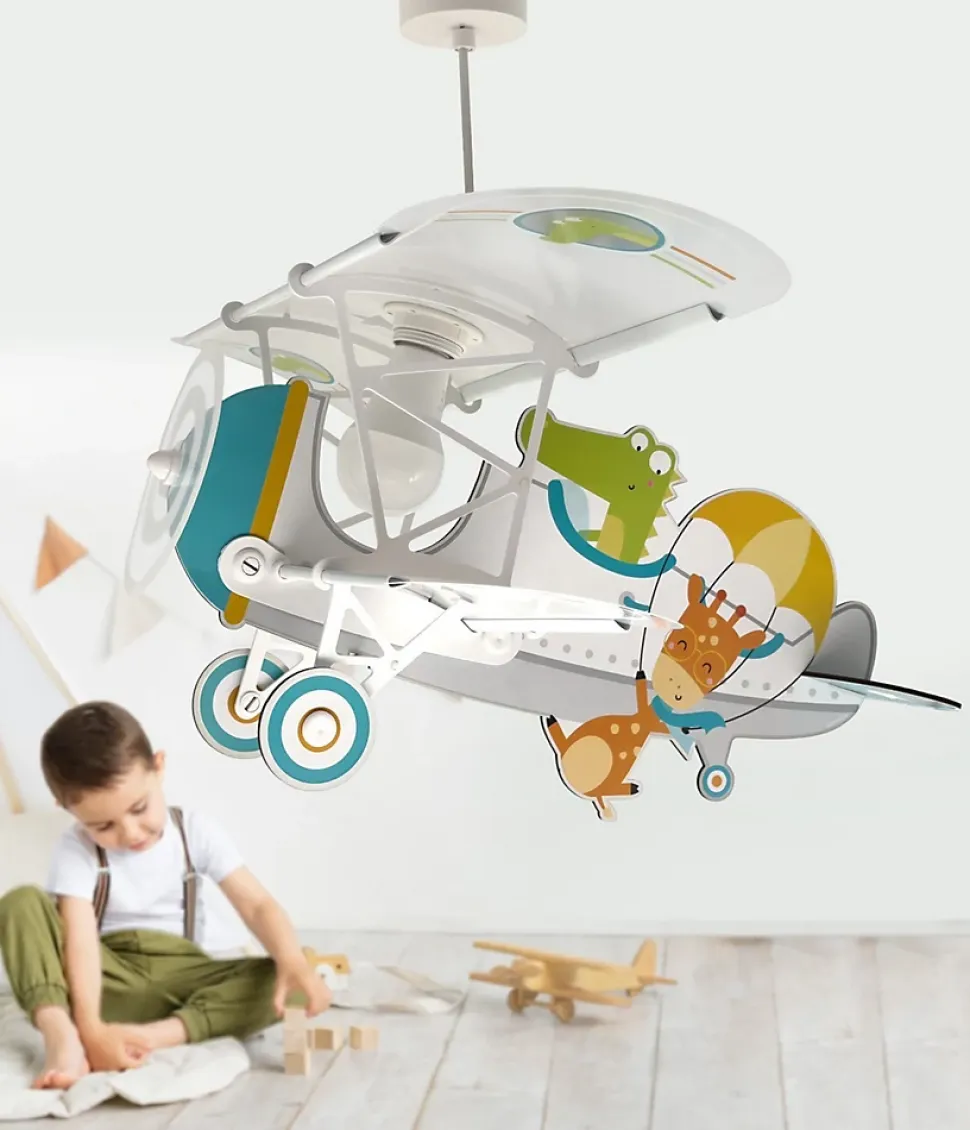 Lustre suspension pour enfant Petit Crocodile prêt à décoller de l’avion crocodile, structure en bois (MDF) avec abat-jour en propylène transparent, inclut la fluorescence (durée d’éclairage dans l’obscurité 10 à 15 minutes, la lumière doit être allumée depuis au au moins 5 minutes).