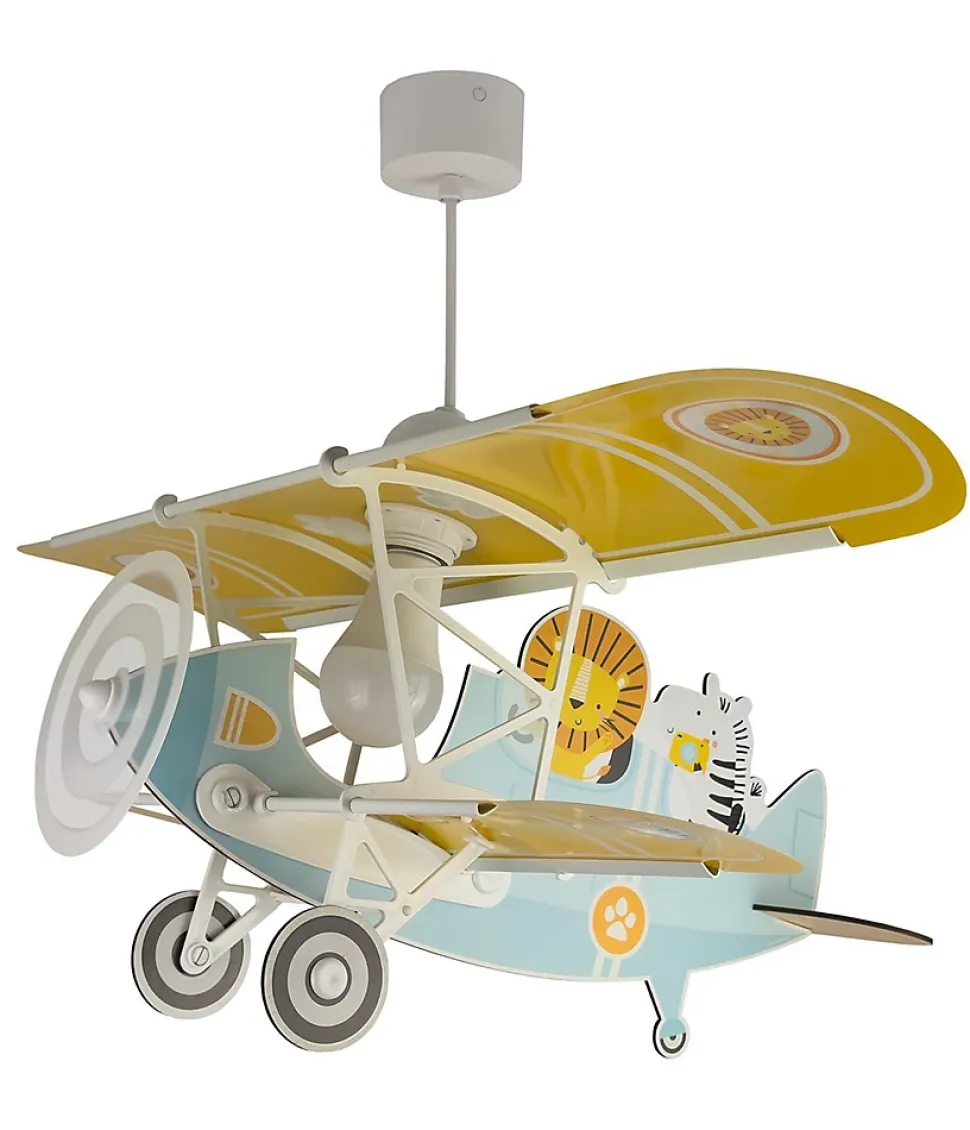 Lustre suspension pour enfant Petit Lion prêt à décoller de l’avion, structure en bois (MDF) avec abat-jour en propylène transparent, inclut la fluorescence (durée d’éclat dans l’obscurité 10 à 15 minutes, la lumière doit être allumée depuis au au moins 5 minutes).