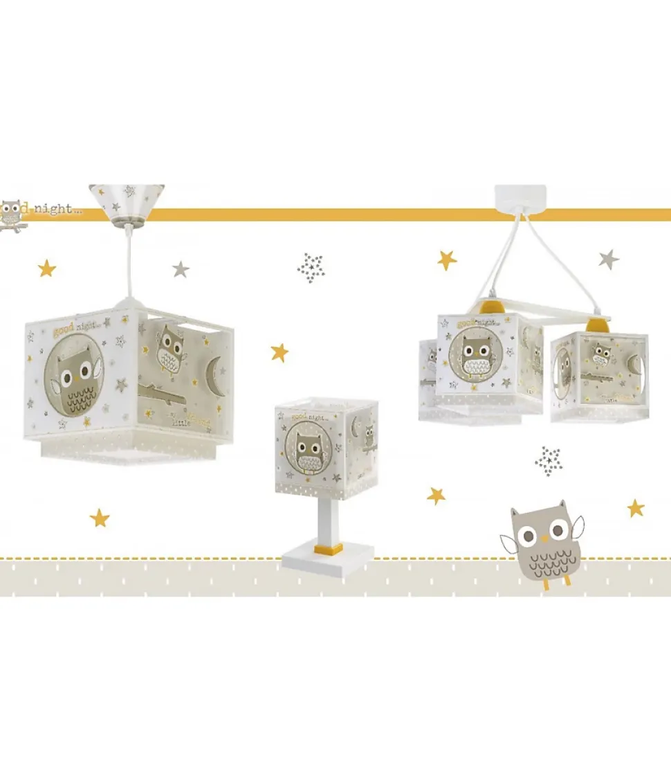 Suspension pour chambre de garçon Good NightIl s’agit de la suspension de chambre de garçon Good Night, qui avec une sympathique décoration chouette et étoile sera chargée d’apporter de la lumière et de la couleur au plafond de la chambre des enfants, générant un éclairage général parfait pour accompagnez-les pendant qu’ils jouent ou font leurs devoirs.Suspension luminaire d’enfant : caractéristiquesLe luminaire pour garçon Good Night, comme le reste de nos collections, est réglable en hauteur afin que vous puissiez l’adapter parfaitement à la hauteur du plafond de la pièce. Il a un double écran en polypropylène transparent, réalisant un effet décoratif unique, et un diffuseur de lumière inférieur pour éviter l’éblouissement. Il a également un effet de fluorescence : lorsque la lumière est éteinte, les personnages brilleront dans le noir pendant quelques minutes grâce à son effet fluorescent !