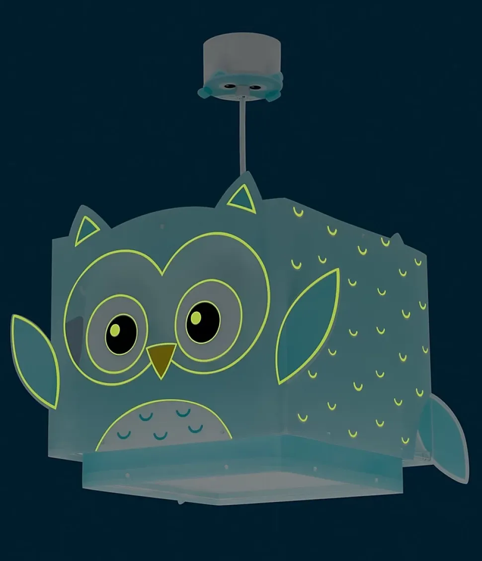 Lampe suspendue avec un hibou aux yeux ouverts et aux yeux fermés, réalisée avec un double abat-jour transparent en vert, ce joli hibou fait l’éclairage le plus original et le plus amusant !.