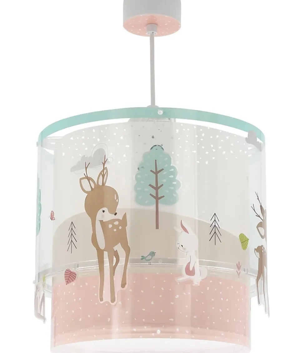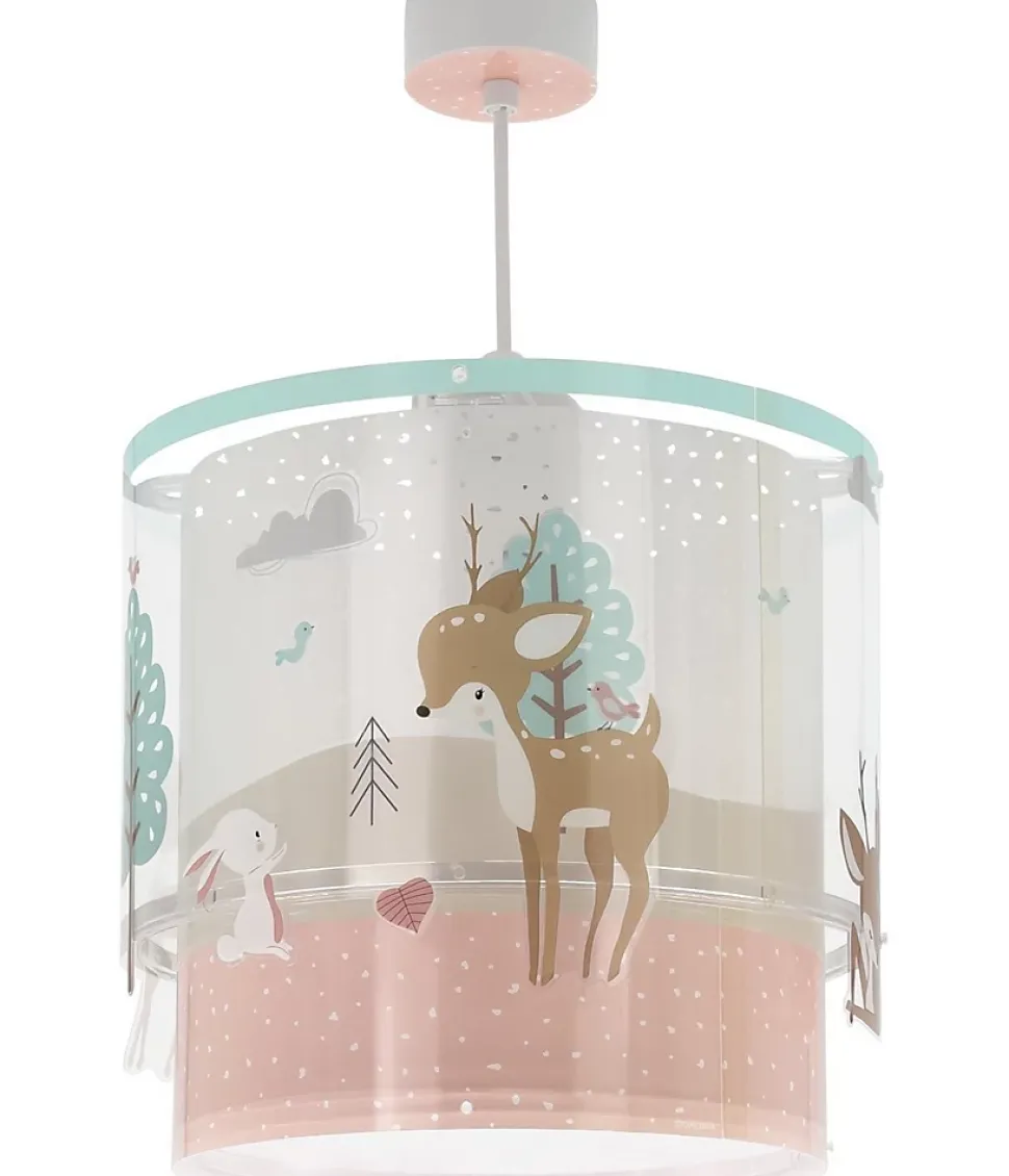 Acheter le luminaire pour enfant Loving DeerLe luminaire Loving Deer est l’une des nouveautés Dalber, et vous y trouverez une tendre scène de conte de fées avec une certaine sympathique et un lapin que les petits de la maison adoreront ! Le design du luminaire pour enfants présente le cerf dans différentes positions – debout, assis… – et ses drôles de compagnons de jeu : un lapin blanc et un petit oiseau. Les couleurs pastel de cette magnifique suspension bébé donneront à la pièce une atmosphère cosy et calmeCaractéristiques du luminaire pour enfant Loving DeerLe luminaire pour enfant Loving Deer sera votre grande alliée pour éclairer et décorer la chambre d’enfant. Nous passons en revue les caractéristiques que vous trouverez dans cette suspension :Le luminaire pour enfants Loving Deer est réglable en hauteur : vous pouvez donner à la lampe la hauteur dont vous avez besoin, vous serez ainsi totalement sûr qu’elle sera parfaite dans la pièceIl dispose d’un double écran en polypropylène transparent : les motifs décoratifs sont divisés en deux écrans différents qui se chevauchent, offrant un effet décoratif unique. Les petits adorent !Le luminaire Loving Deer dispose d’un diffuseur de lumière inférieur amovible, qui permettra aux enfants de recevoir une lumière douce sans éblouissement qui les éblouit