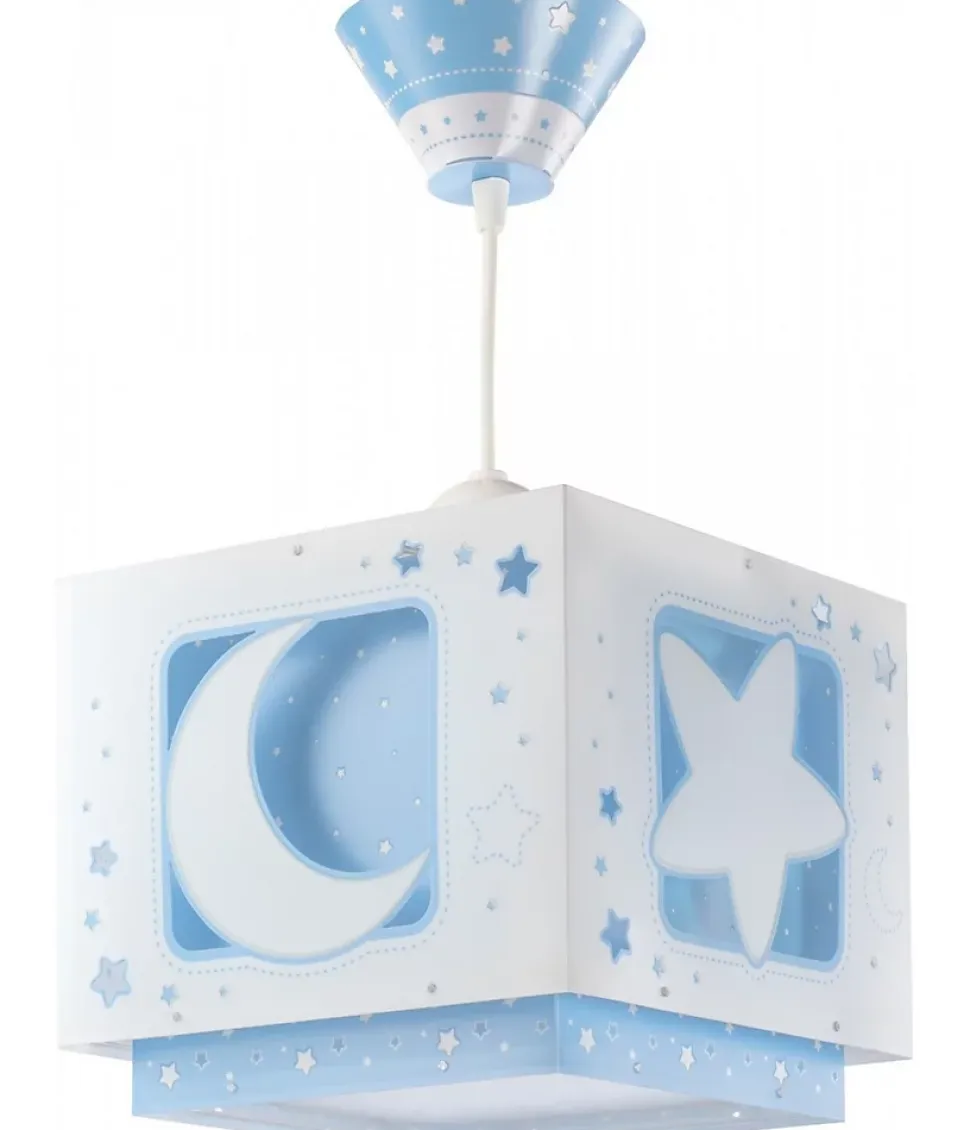Lustre chambre bébé garçon Moonlight bleuLe luminaire de chambre d’enfant Moonlight est parfait pour donner une touche élégante à la chambre d’enfant : avec une décoration lune et étoiles et un double abat-jour transparent, c’est l’un des designs par excellence de nos collections.Luminaire de lune et étoiles pour enfantsLa lampe pour enfants Moonlight, en polypropylène transparent, a un effet de fluorescence, elle brille donc dans le noir et les petits l’adorent ! Il est également réglable en hauteur pour s’adapter parfaitement à la pièce et dispose d’un diffuseur de lumière inférieur amovible pour éviter l’éblouissement.