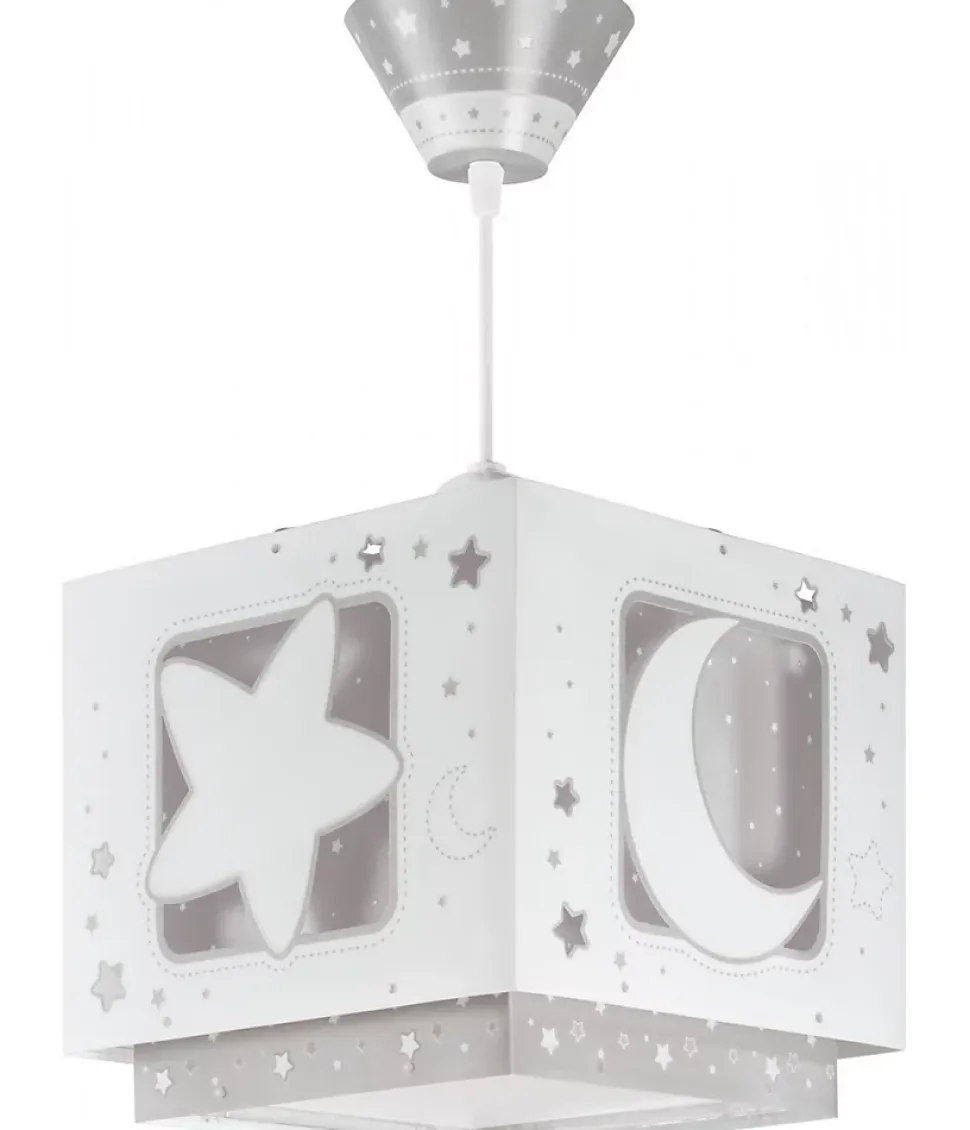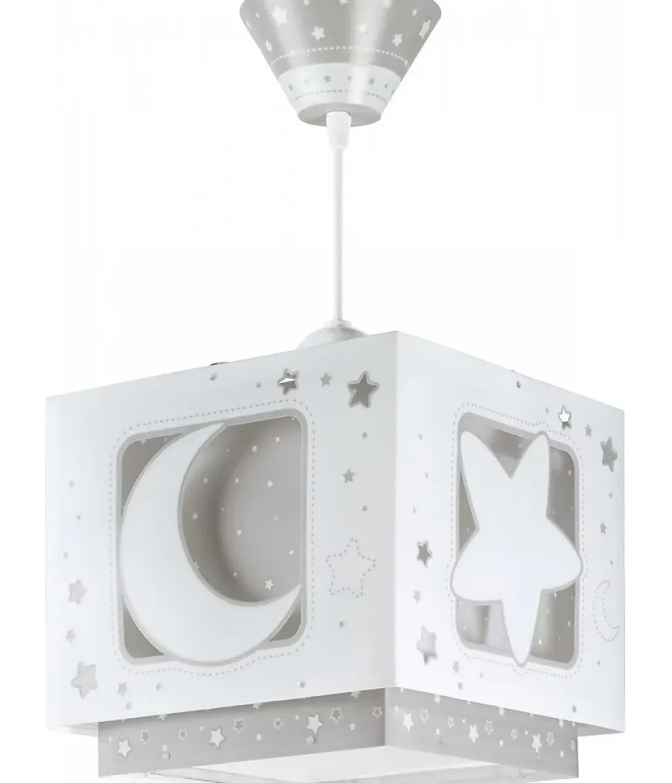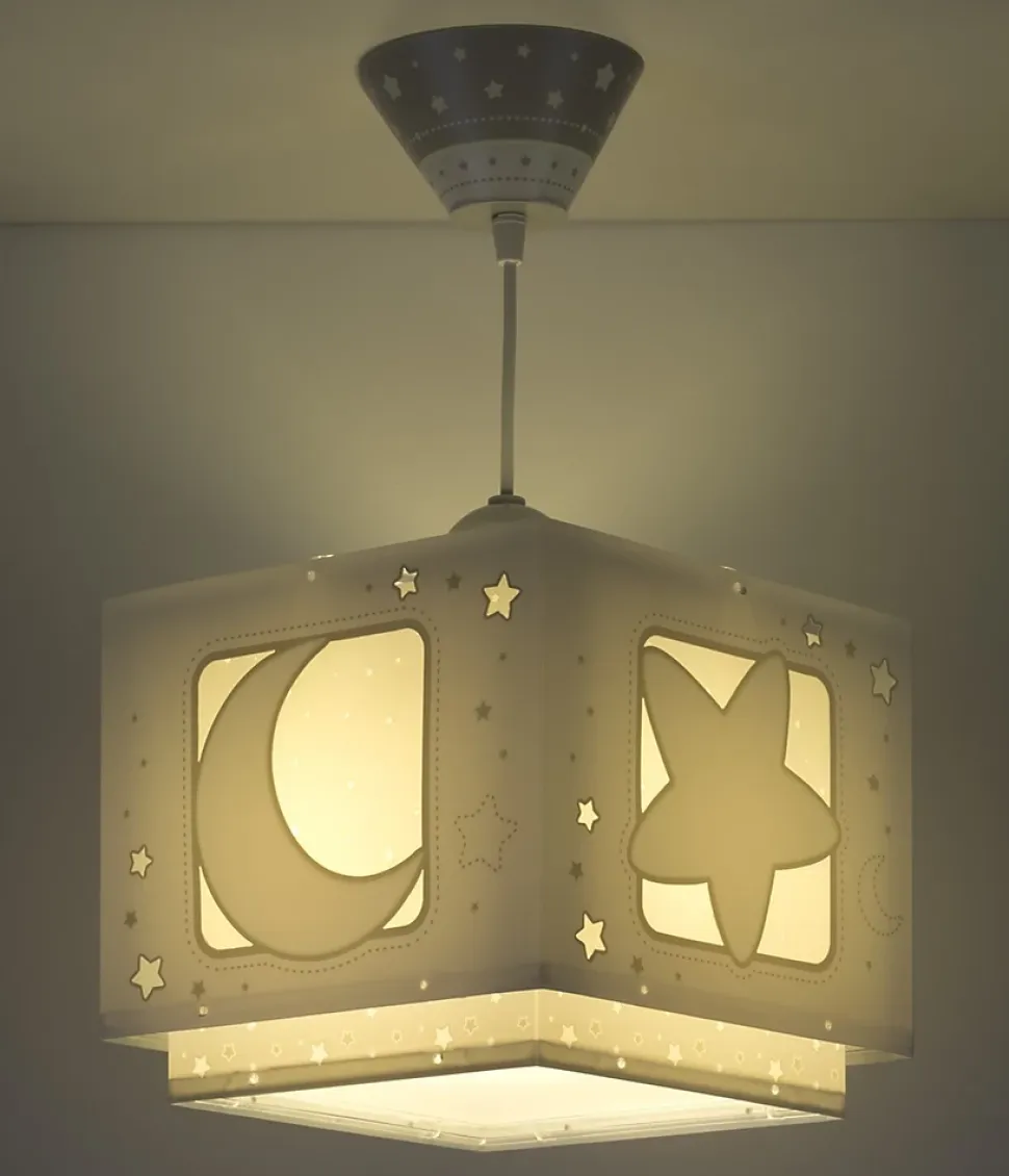 Lustre chambre bébé garçon Moonlight grisLe luminaire de chambre d’enfant Moonlight est parfait pour donner une touche élégante à la chambre d’enfant : avec une décoration lune et étoiles et un double abat-jour transparent, c’est l’un des designs par excellence de nos collections.Luminaire de lune et étoiles pour enfantsLa lampe pour enfants Moonlight, en polypropylène transparent, a un effet de fluorescence, elle brille donc dans le noir et les petits l’adorent ! Il est également réglable en hauteur pour s’adapter parfaitement à la pièce et dispose d’un diffuseur de lumière inférieur amovible pour éviter l’éblouissement.