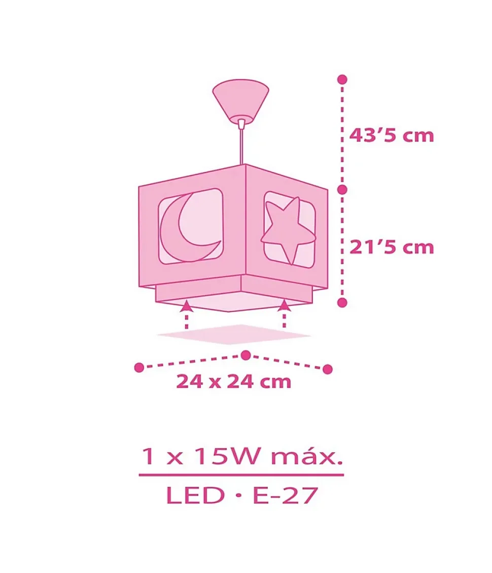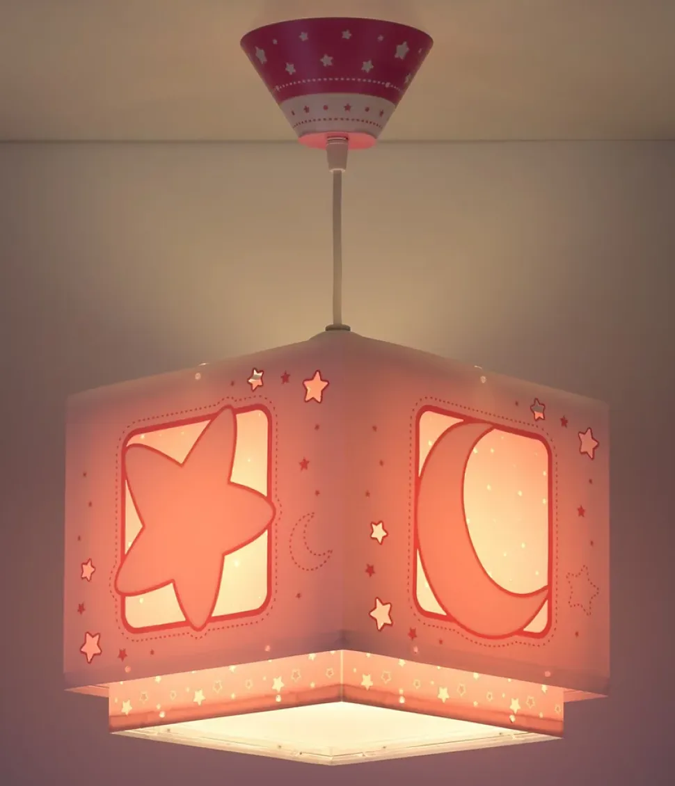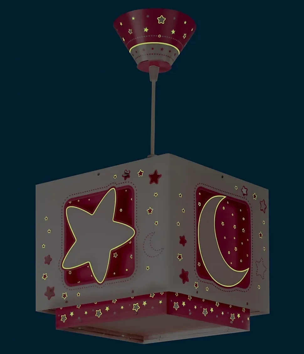 Lustre chambre bébé garçon Moonlight roseLe luminaire de chambre d’enfant Moonlight est parfait pour donner une touche élégante à la chambre d’enfant : avec une décoration lune et étoiles et un double abat-jour transparent, c’est l’un des designs par excellence de nos collections.Luminaire de lune et étoiles pour enfantsLa lampe pour enfants Moonlight, en polypropylène transparent, a un effet de fluorescence, elle brille donc dans le noir et les petits l’adorent ! Il est également réglable en hauteur pour s’adapter parfaitement à la pièce et dispose d’un diffuseur de lumière inférieur amovible pour éviter l’éblouissement.