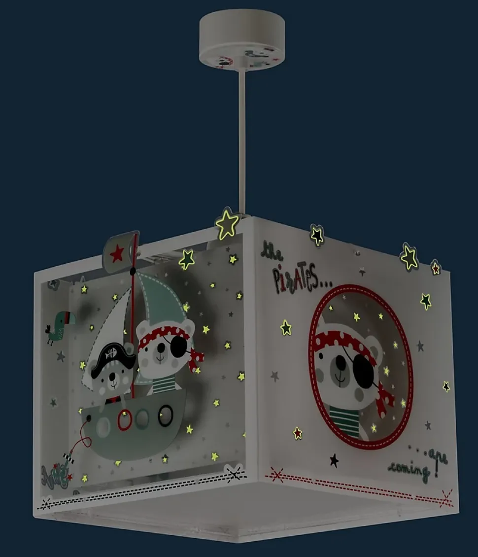 Achetez lustre pour enfant avec pirate The PiratesLe lustre enfant pirate The Pirates vous apporte une décoration marine originale pour la chambre d’enfant. Ajoutez une touche colorée avec son double écran en polypropylène transparent et les motifs d’ours pirate. La suspension pour enfants avec pirate est réglable en hauteur, elle s’intégrera donc parfaitement dans la chambre des enfants, et intègre un diffuseur de lumière inférieur amovible pour que la lumière soit toujours adéquate et sans éblouissement.Le luminaire The Pirates a un effet de fluorescence dans l’obscurité. Lorsque vous éteignez la lumière, l’effet de fluorescence surprendra les petits de la maison pendant quelques minutes !