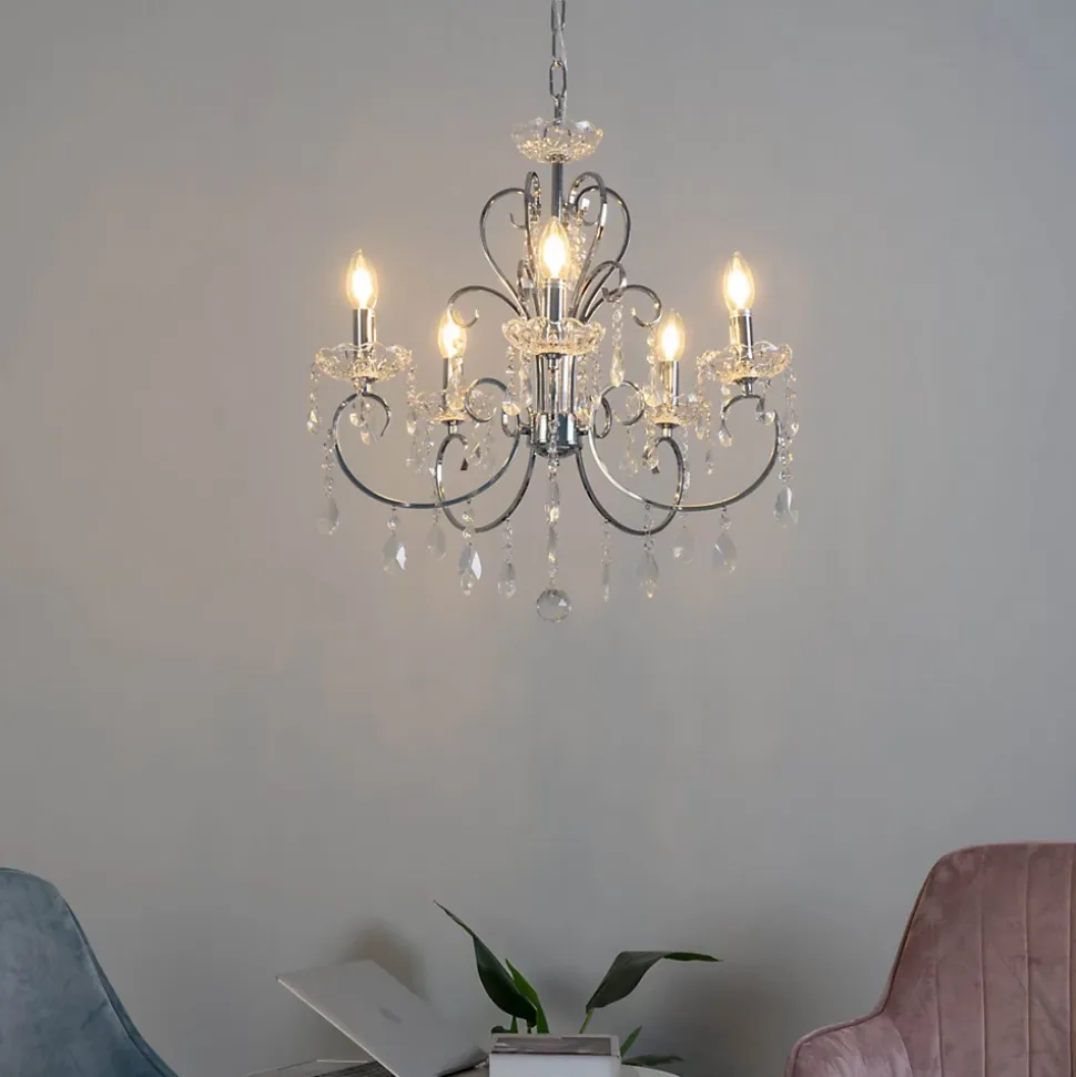 Donnez une touche d’opulence à votre décoration intérieure avec le somptueux lustre Pavia en métal argenté. Avec ses 5 coupelles en verre et ses branches argentées ornées de pampilles en cristal, ce luminaire offre un éclat raffiné et élégant. Disponible également en version dorée, ainsi qu’en applique avec 2 bras dorés ou argentés.) Assemblage à faire par vos soins (