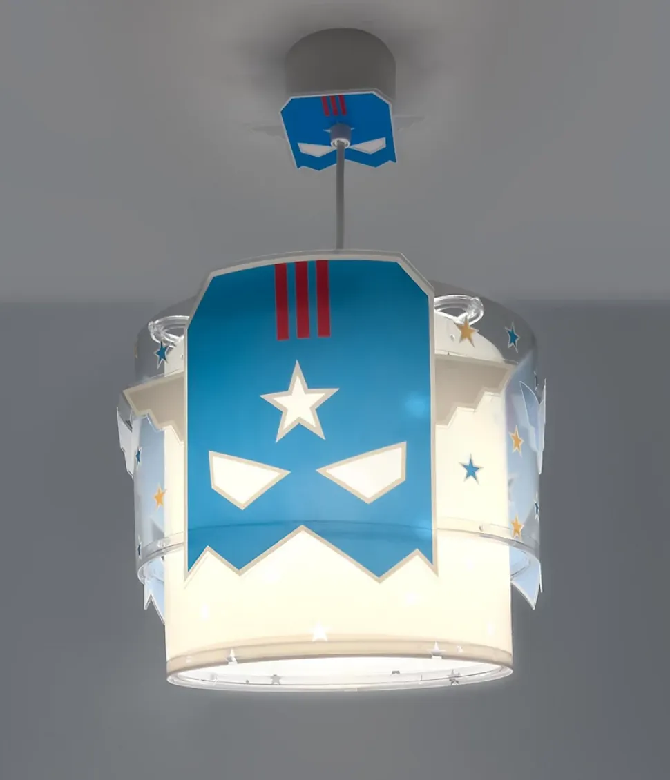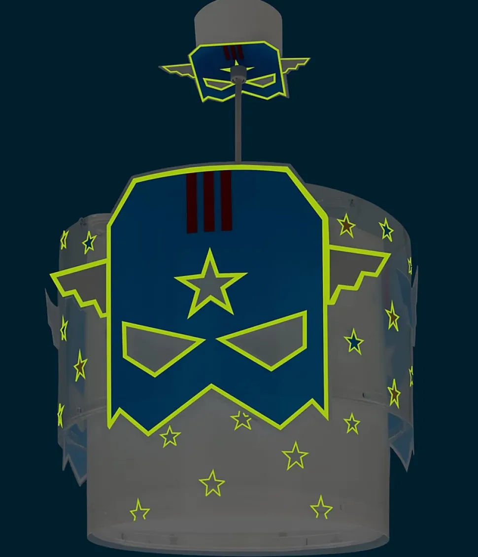 Plafonnier pour enfants Blue Hero. Éveillez votre courage et votre imagination avec ce super-héros et transformez chaque nuit en une aventure épique. Fabriqué avec double écran en polypropylène transparent. Brille dans le noir !