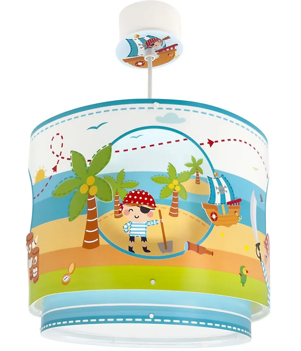 Plafonnier pour enfants Pirate Island. Île en vue ! L’aventure commence avec ce sympathique pirate en quête de trésor. Réalisé avec un double écran et avec des figures découpées pour un effet bidimensionnel.