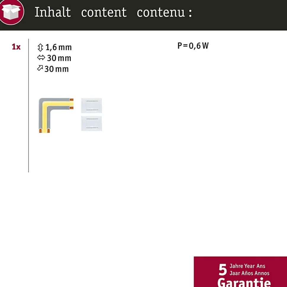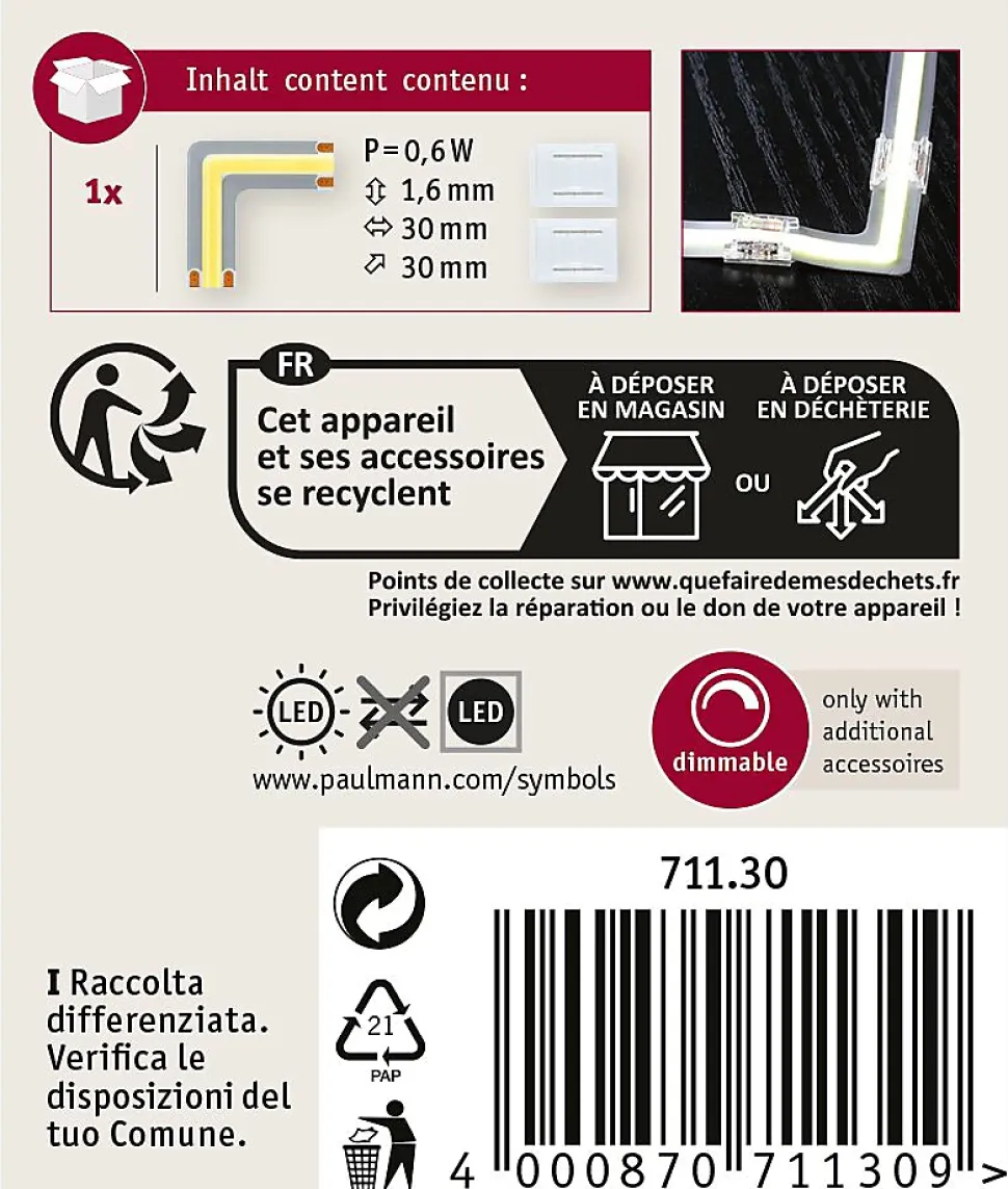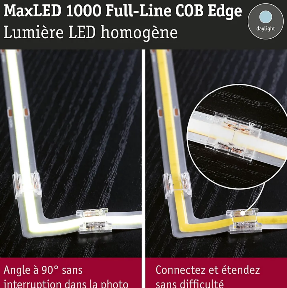 Les angles MaxLED 1000 Edge Full-Line COB sont le complément parfait d’un concept d’éclairage MaxLED 1000 Full-Line COB requérant une pose coudée. Les angles COB des strips blanc lumière du jour permettent de les déplacer à 90° sans interrompre leur halo lumineux. Chaque angle est livré avec deux connecteurs lumineux pour le raccordement. L’angle peut être raccordé de manière universelle dans les deux sens, à gauche ou à droite. Plan de travail de cuisine, atelier ou autres surfaces, les strips MaxLED 1000 Full-Line COB sont si puissants qu’ils peuvent être utilisés sans problème comme éclairage d’intérieur.