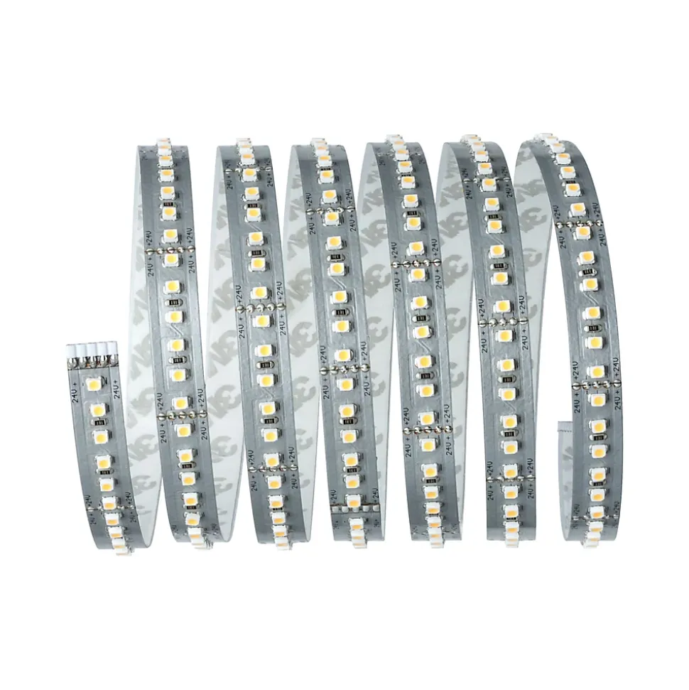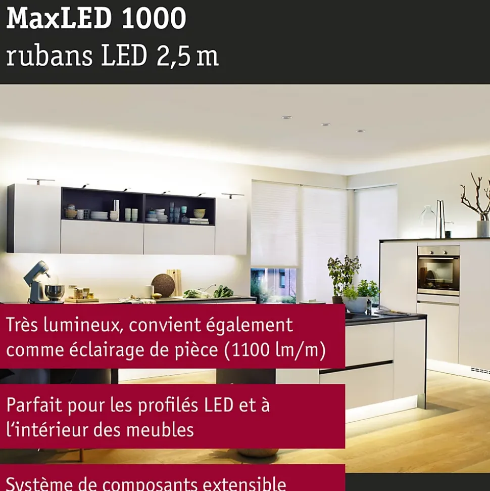Strips individuels pour extension des kits de base MaxLED peuvent être raccourcis en fonction de la longueur souhaitée. Le revêtement protège contre l’aspersion et la poussière. Température de couleur : 2700K – Blanc chaud
