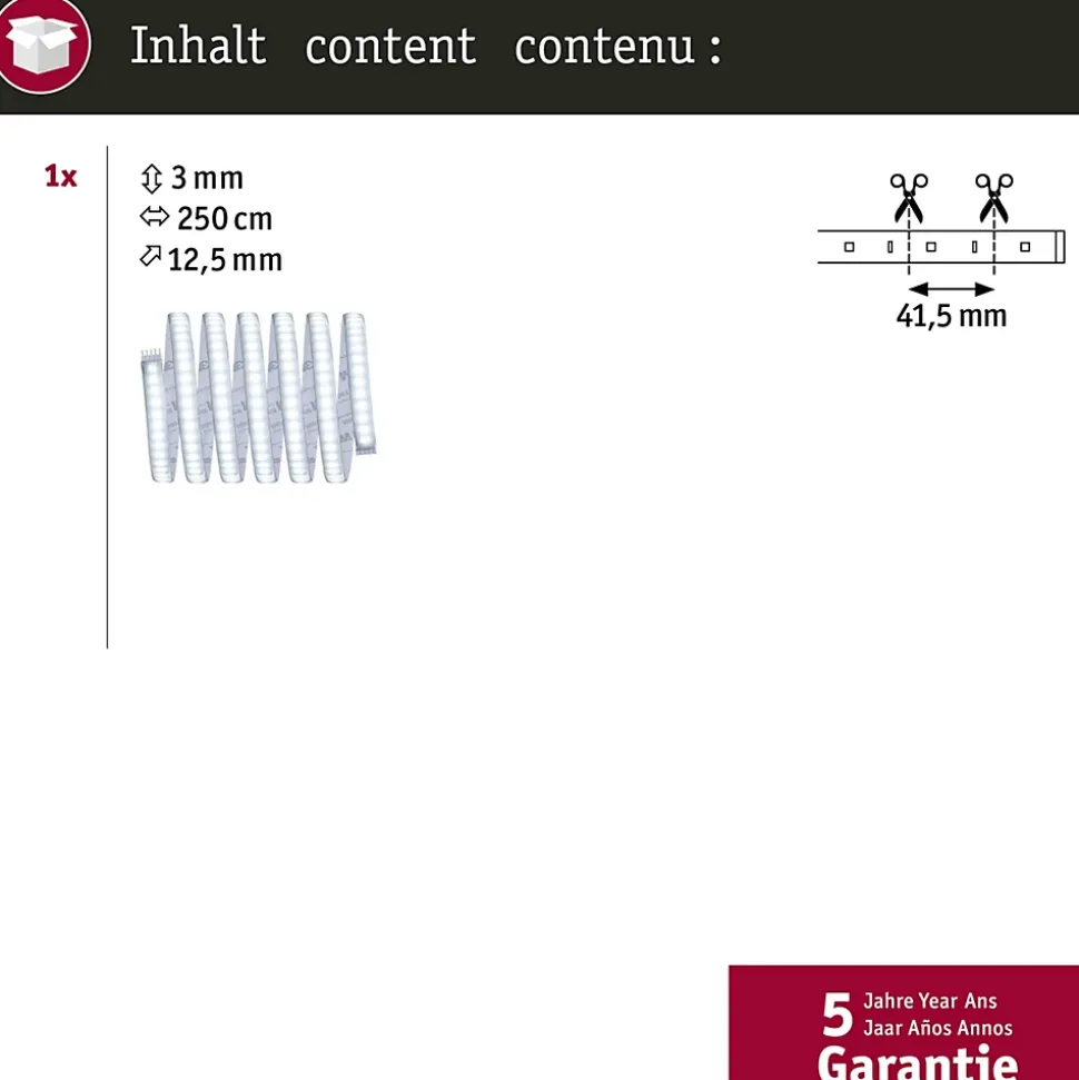 IP44 – Protection contre les projections d’eau, y compris en extérieur|Rubans individuels|Peut être raccourci en fonction de la longueur souhaitée|Face arrière autocollante pour un montage simple|Matériel flexible pour le montage sur des surfaces planes ou courbes|Montage simple par système de connexion