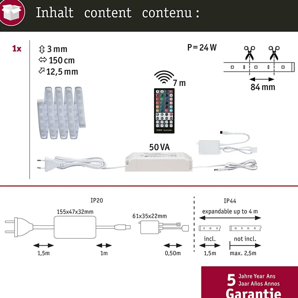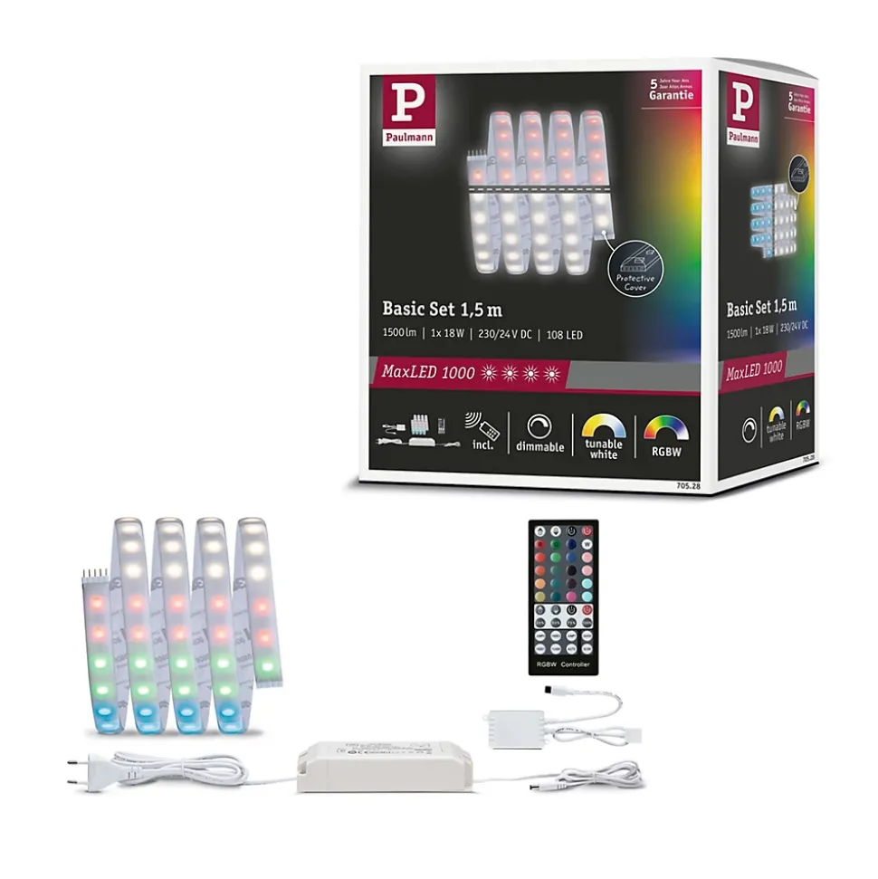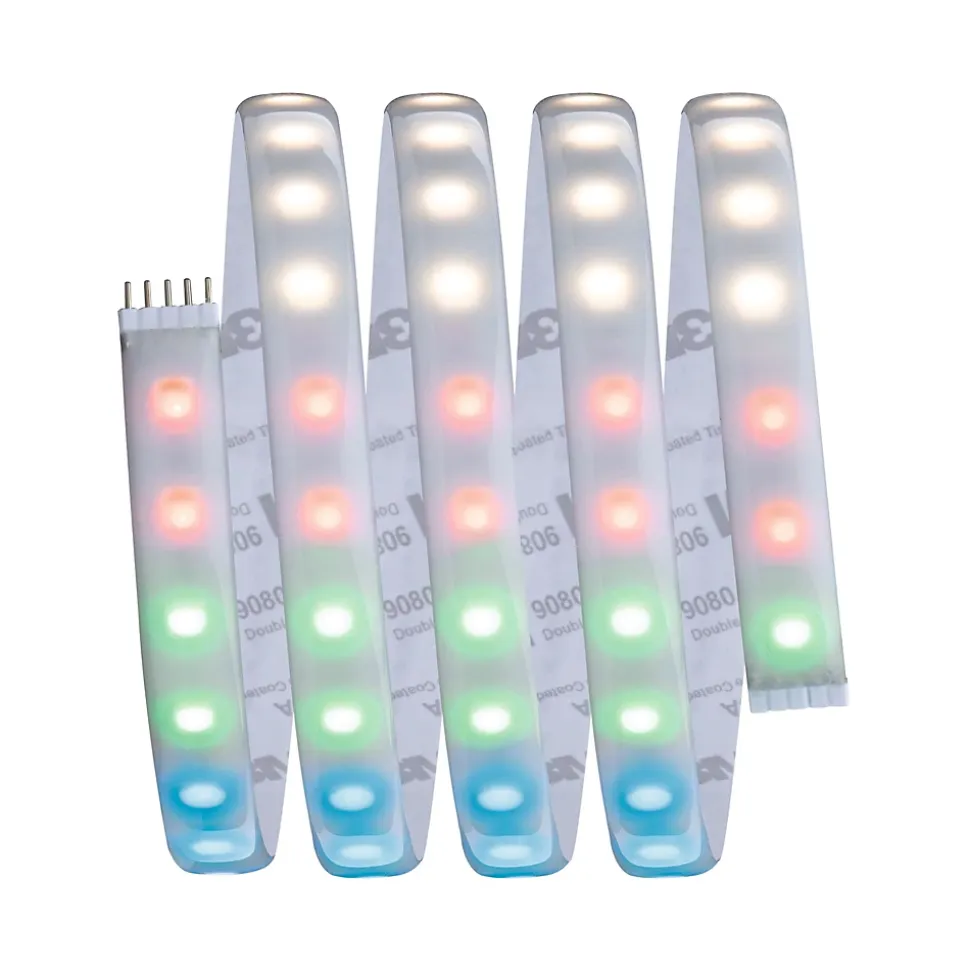 Kit complet avec ruban, alimentation et télécommande|La fonction RGBW permet de choisir librement la température de couleur|Protection IP : IP44 – Protection contre les projections d’eau|Le revêtement protège contre l’aspersion et la poussière.|Face arrière autocollante pour un montage simple|Matériel flexible pour le montage sur des surfaces planes ou courbes|Température de couleur: 3000K – Blanc chaud|La technologie LED fait économiser jusqu’à 80 % d’énergie par rapport aux ampoules à incandescence classiques.|Inclus le connecteur à 5 broches pour une connexion simple au ruban|Peut être raccourci en fonction de la longueur souhaitée|Montage simple par système de connexion