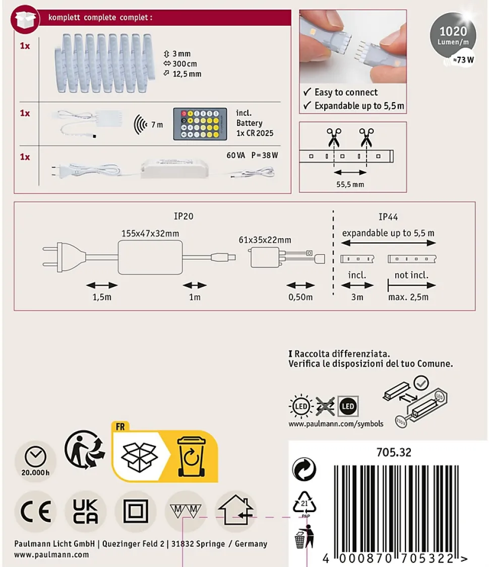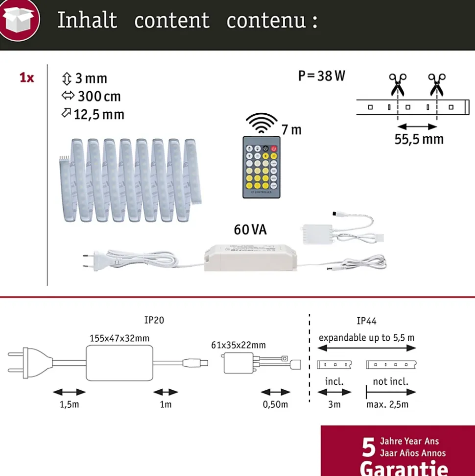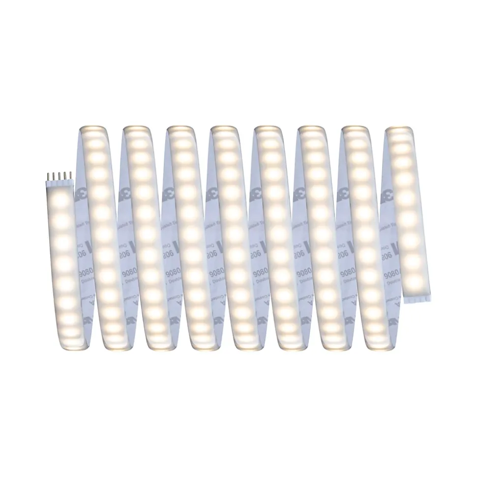 Le strip d’une longueur de 3 m offre une intensité lumineuse de ~ 1000lm/m et peut ainsi servir d’éclairage de base. Ils sont particulièrement impressionnants dans les profilés. Grâce à la commande de la lumière blanche intelligente Tunable White, vous pouvez personnaliser la température de couleur du strip d’un blanc lumière du jour en guise d’éclairage de travail à un blanc chaud plus propice à la relaxation. Outre le ruban, le kit de base contient une télécommande, un récepteur et un ballast. Il est possible, au besoin, d’étendre le système à l’aide de strips et de connecteurs supplémentaires. La longueur maximale indiquée ne doit pas être dépassée.