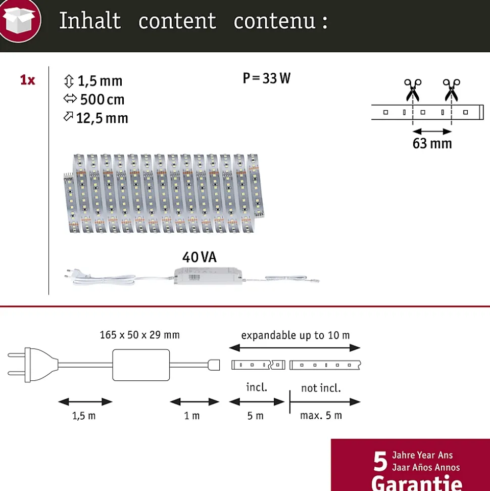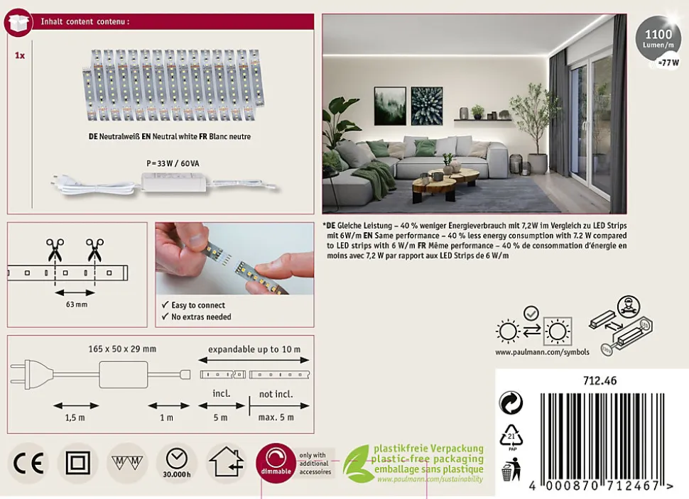 Kit complet avec Strip et alimentation|Strip LED à haute efficacité 40 % d’énergie en moins pour le même rendement lumineux|Température de couleur: 4000K – Blanc neutre|Peut être raccourci en fonction de la longueur souhaitée|Face arrière autocollante pour un montage simple|Gradable avec le contrôleur variateur/commutateur MaxLED|Aménagements personnalisés|Montage simple par système de connexion