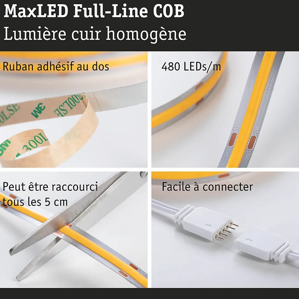 Les strips MaxLED 1000 Full-Line COB sont si puissants qu’ils peuvent être utilisés sans problème comme éclairage d’intérieur. Le kit de base MaxLED 1000 COB avec 528 LED/m produit un rayonnement absolument homogène sans points lumineux visibles. Le connecteur lumineux permet une connexion parfaite qui prolonge le visuel lumineux linéaire sans interruption visible. Le Strip de 10 mm est particulièrement étroit et se glisse donc facilement dans les profilés LED filigranes. L’angle de rayonnement large de 180° répartit la lumière à merveille sans ombre portée. Une couche continue de phosphore protège les LED de la poussière et de l’humidité, les points de contact ont l’IP20. La prolongation du kit de base blanc chaud est facile à l’aide d’un strip individuel adapté.