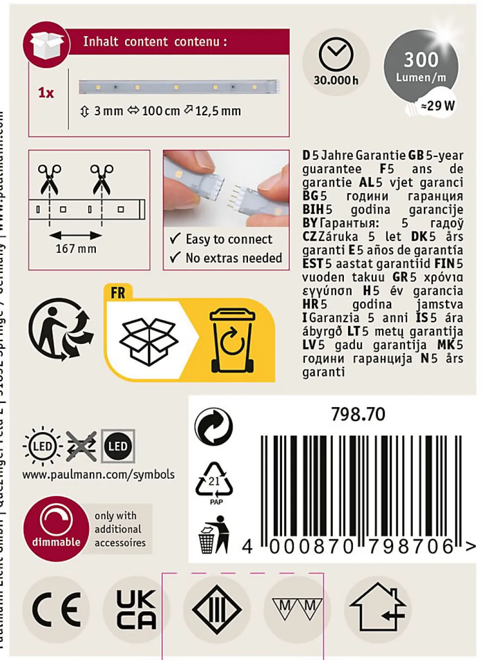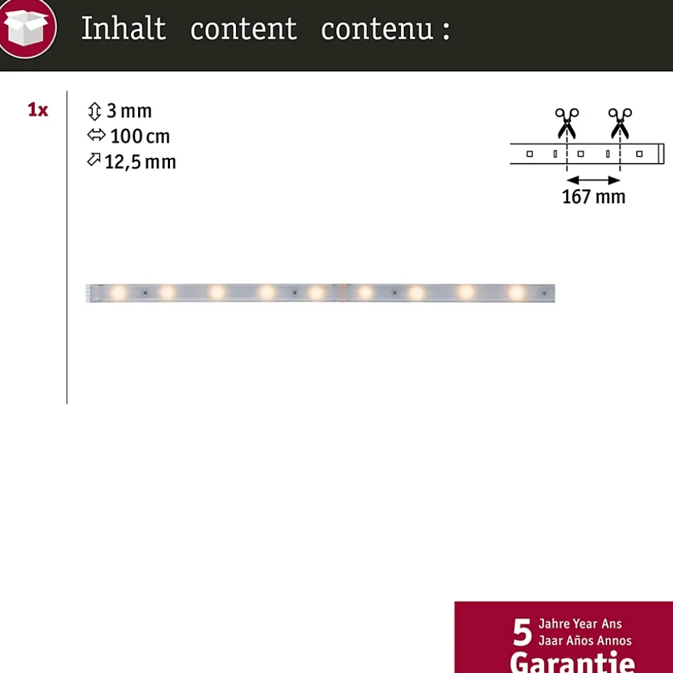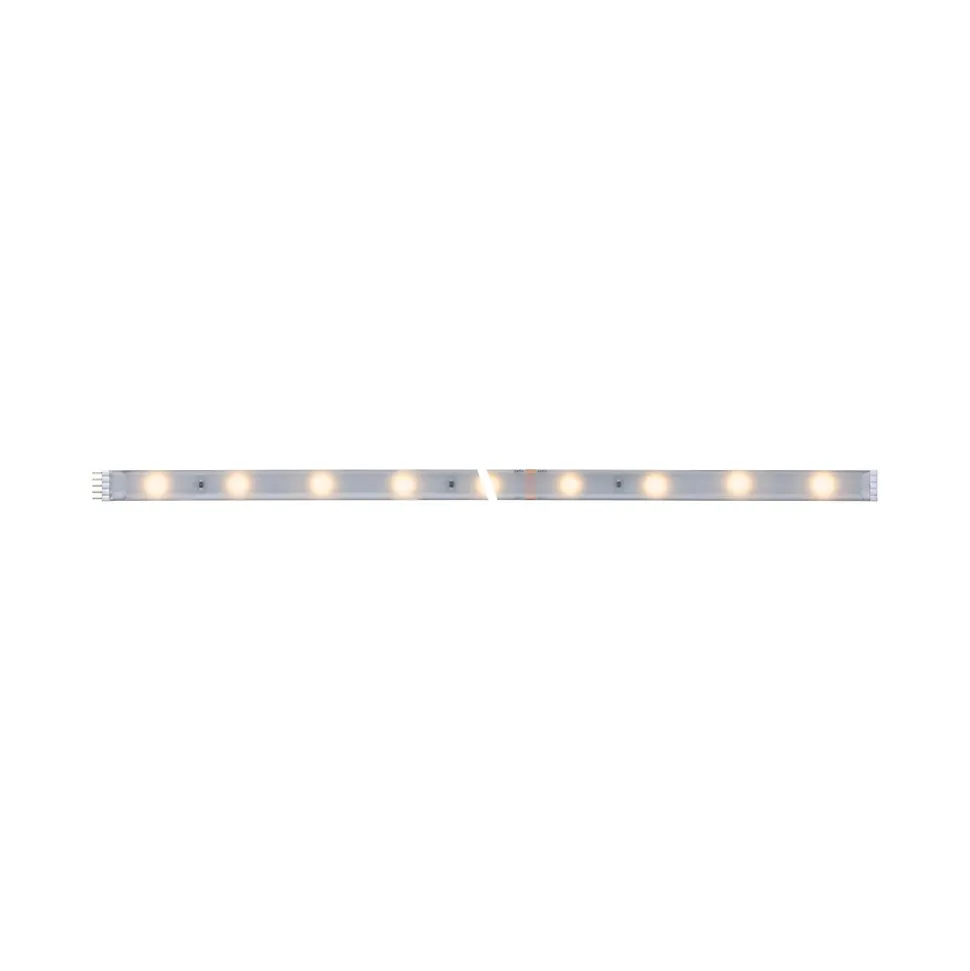 Rubans individuels|Pour extension des kits de base MaxLED|IP44 – Protection contre les projections d’eau, y compris en extérieur|Température de couleur: 2700K – Blanc chaud|Peut être raccourci en fonction de la longueur souhaitée|Face arrière autocollante pour un montage simple|Matériel flexible pour le montage sur des surfaces planes ou courbes|La technologie LED fait économiser jusqu’à 80 % d’énergie par rapport aux ampoules à incandescence classiques.|Montage simple par système de connexion