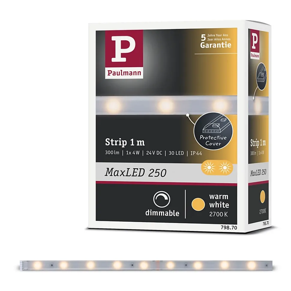 Ce Strip MaxLED 250 d’une longueur de 1m est pourvu du gainage IP44 nouvelle génération « Protecting Cover », ce qui en fait l’équipement idéal pour les pièces humides. Il est le complément parfait du kit de base. Avec 4 watts, les Strips MaxLED sont si puissants qu’ils peuvent être utilisés sans problème comme éclairage d’intérieur. Ils sont particulièrement impressionnants dans les profilés. Les strips blanc chaud délivrent un éclairage d’ambiance et fonctionnel agréable et relaxant.