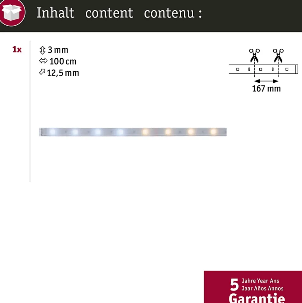 Ce Strip MaxLED 250 d’une longueur de 1m est pourvu du gainage IP44 nouvelle génération « Protecting Cover », ce qui en fait l’équipement idéal pour les pièces humides. Il est le complément parfait du kit de base. Avec 4 watts, les Strips MaxLED sont si puissants qu’ils peuvent être utilisés sans problème comme éclairage d’intérieur. Ils sont particulièrement impressionnants dans les profilés. Grâce à la commande de la lumière blanche intelligente Tunable White, vous personnalisez la température de couleur du strip, du blanc lumière du jour de l’éclairage de travail, au blanc chaud de la lumière de relaxation.