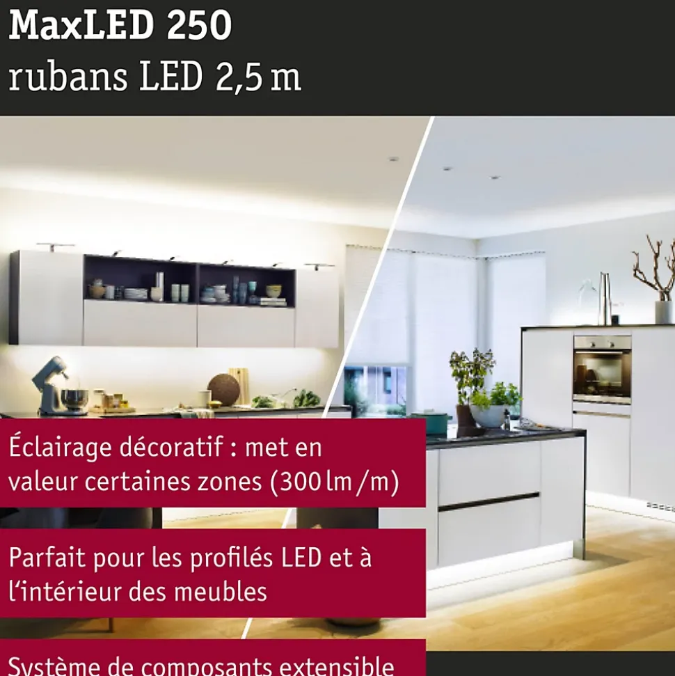 Ce Strip MaxLED 250 d’une longueur de 2,5m est le complément parfait du kit de base. Avec 9 watts, les Strips MaxLED sont si puissants qu’ils peuvent être utilisés sans problème comme éclairage d’intérieur. Ils sont particulièrement impressionnants dans les profilés. Grâce à la commande de la lumière blanche intelligente Tunable White, vous personnalisez la température de couleur du strip, du blanc lumière du jour de l’éclairage de travail, au blanc chaud de la lumière de relaxation.