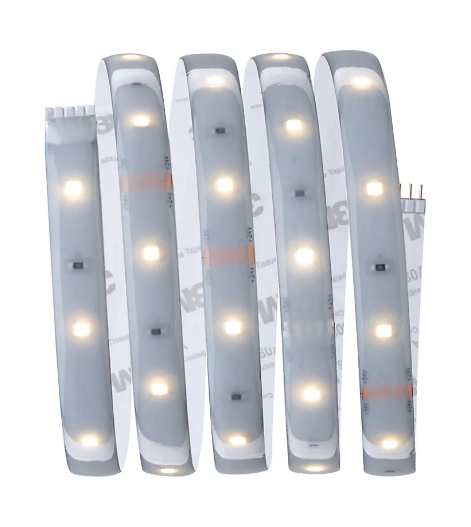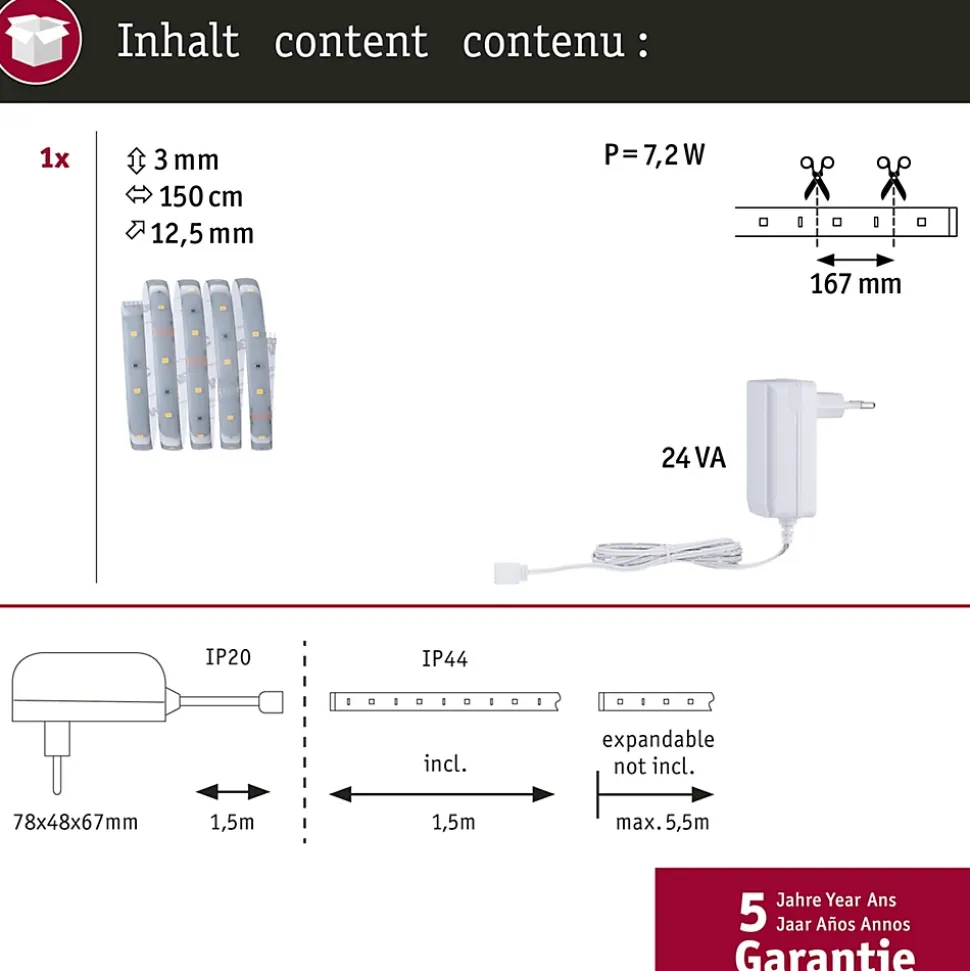 Kit complet avec ruban et alimentation|IP44 – Protection contre les projections d’eau, y compris en extérieur|Température de couleur: 2700K – Blanc chaud|Peut être raccourci en fonction de la longueur souhaitée|Face arrière autocollante pour un montage simple|Matériel flexible pour le montage sur des surfaces planes ou courbes|La technologie LED fait économiser jusqu’à 80 % d’énergie par rapport aux ampoules à incandescence classiques.|Inclus le connecteur à 5 broches pour une connexion simple au ruban|Montage simple par système de connexion