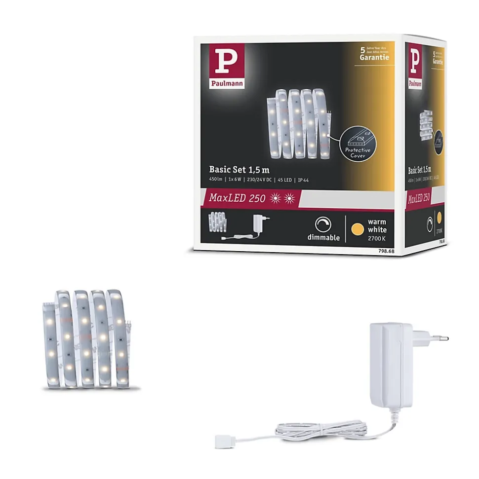Le kit de base MaxLED 250 comprend en plus des Strips d’une longueur de 1,5m, un ballast électronique adapté. Il est possible, au besoin, d’étendre le système à l’aide d’une unité de commande avec télécommande. Avec son gainage IP44 nouvelle génération « Protecting Cover », le kit de base convient également pour les pièces humides. Avec 6 watts, les Strips MaxLED sont si puissants qu’ils peuvent être utilisés sans problème comme éclairage d’intérieur. Ils sont particulièrement impressionnants dans les profilés. Les strips blanc chaud délivrent un éclairage d’ambiance et fonctionnel agréable et relaxant.