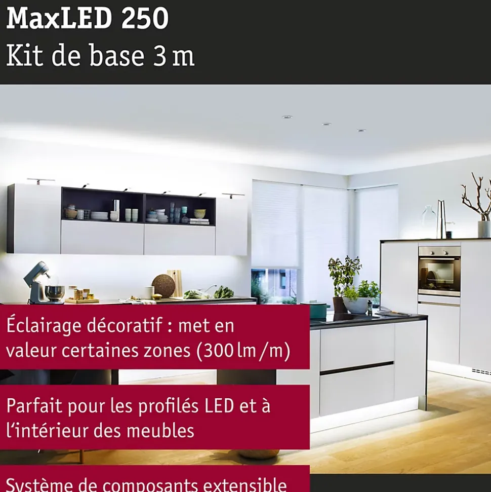 Le kit de base MaxLED 250 comprend en plus des Strips d’une longueur de 3 »5,5m, un ballast électronique adapté. Il est possible, au besoin, d’étendre le système à l’aide d’une unité de commande avec télécommande. Avec 12 watts, les Strips MaxLED 250 sont si puissants qu’ils peuvent être utilisés sans problème comme éclairage d’intérieur. Ils sont particulièrement impressionnants dans les profilés. Les strips blancs lumière du jour sont conçus pour les éclairages d’ambiance et fonctionnels stimulants et favorisant la concentration.