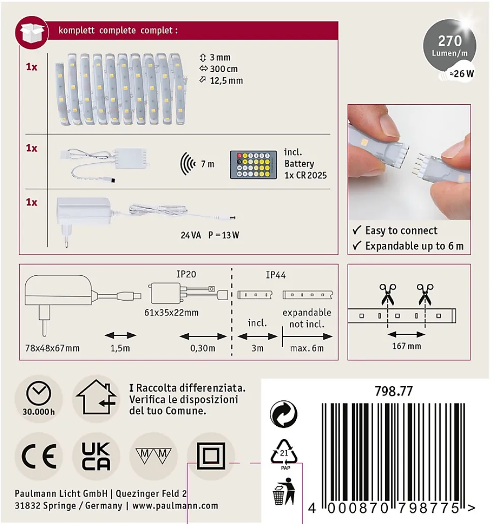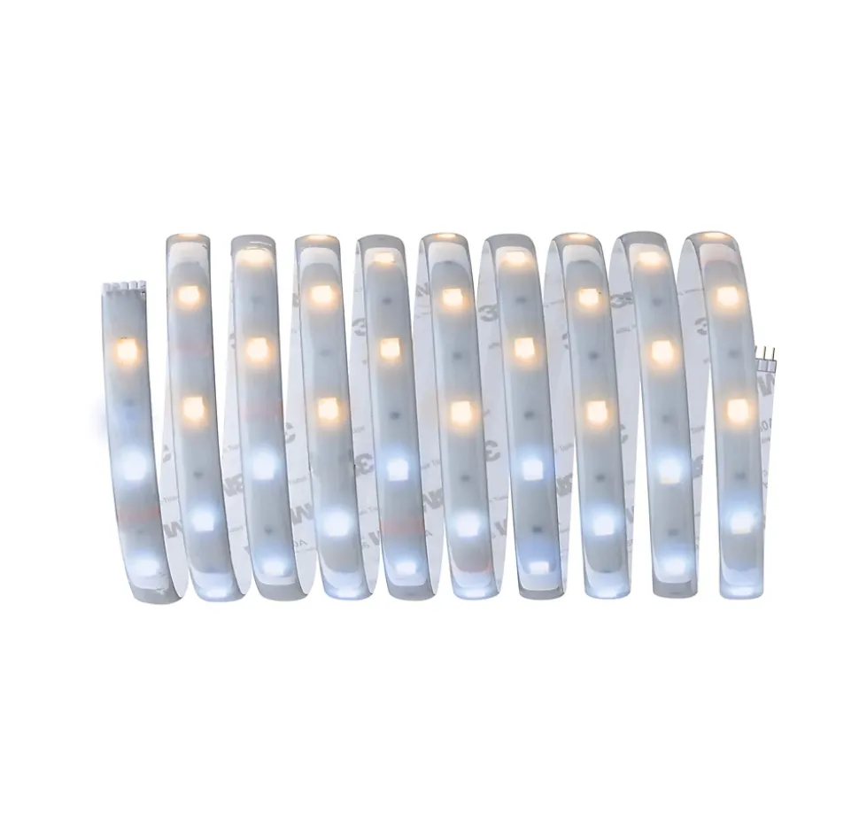 Kit complet avec ruban, alimentation et contrôleur Tunable White|Avec commande de la lumière blanche (Tunable White)|IP44 – Protection contre les projections d’eau, y compris en extérieur|Température de couleur: 2700K Blanc chaud – 6500K – Lumière du jour|Peut être raccourci en fonction de la longueur souhaitée|Face arrière autocollante pour un montage simple|Matériel flexible pour le montage sur des surfaces planes ou courbes|La technologie LED fait économiser jusqu’à 80 % d’énergie par rapport aux ampoules à incandescence classiques.|Inclus le connecteur à 5 broches pour une connexion simple au ruban|Montage simple par système de connexion