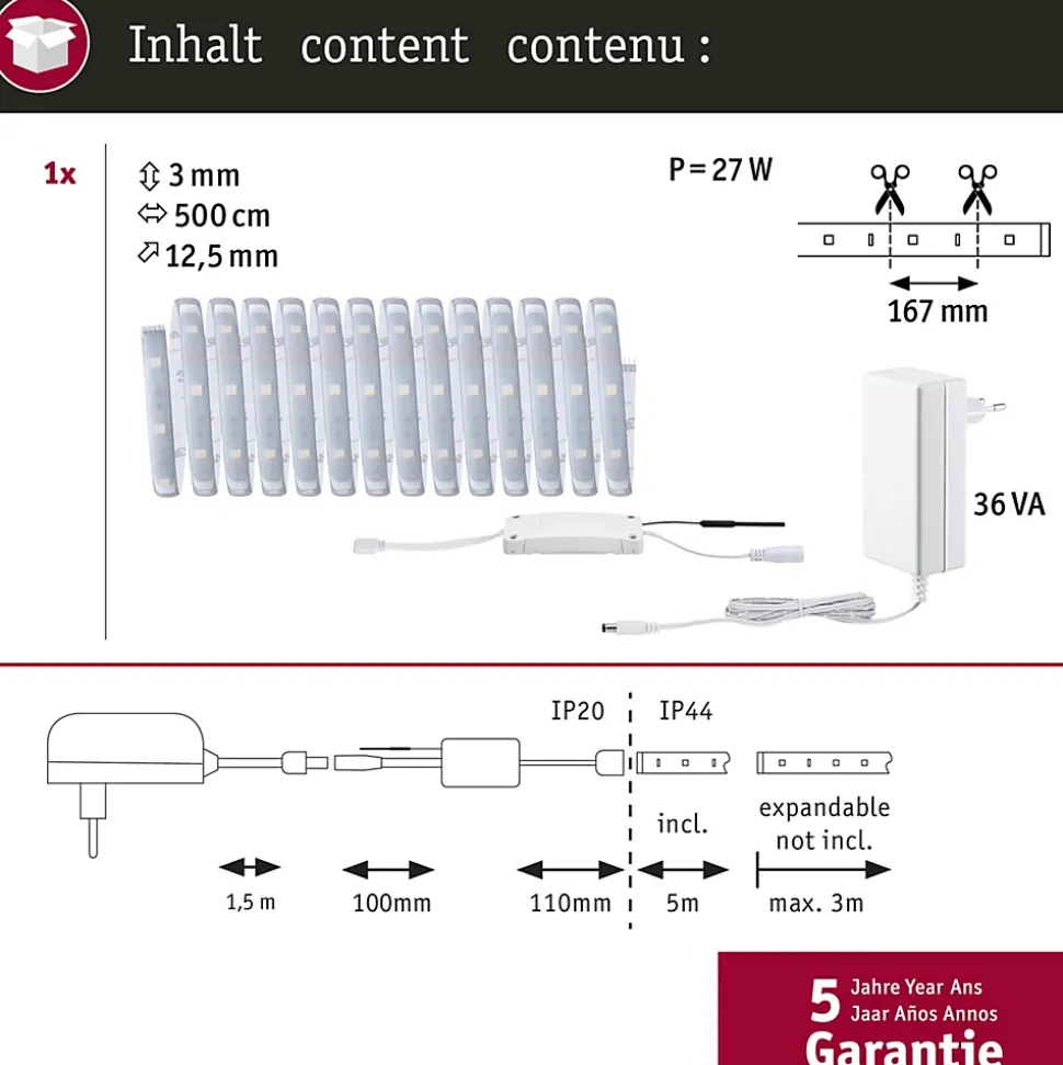 Les Strips MaxLED 250 d’une puissance de 22 watts produisent une lumière décorative agréable. Intégrant la fonction Zigbee 3.0, ils séduisent par leur fonctionnement intelligent. Grâce à la commande de couleur, vous pouvez créer une ambiance personnalisée, que ce soit un éclairage permanent unicolore ou des effets lumineux multicolores. Une diode blanche (W) assure de plus une confortable lumière blanc chaud et rend superflu le mélange d’un ton blanc avec les couleurs rouge, vert et bleu (RGB). Outre le ruban avec revêtement (Protect Cover) d’une longueur de 5 m, le kit de base contient un ballast adapté et un Controller Zigbee 3.0 qui permet une commande intelligente. Une télécommande ou une passerelle pour la commande intelligente ne sont pas comprises dans ce set de base. Zigbee 3.0 est un protocole de transmission radio qui met en réseau les appareils de différents fabricants. Le ballast contient une réserve de performance supplémentaire, ce qui permet le cas échéant de pouvoir le prolonger avec d’autres Strips. Les Strips MaxLED sont particulièrement impressionnants dans les profilés. Paulmann propose en outre une gamme fournie de profilés encastrés ou en saillie assortis aux Strips MaxLED.