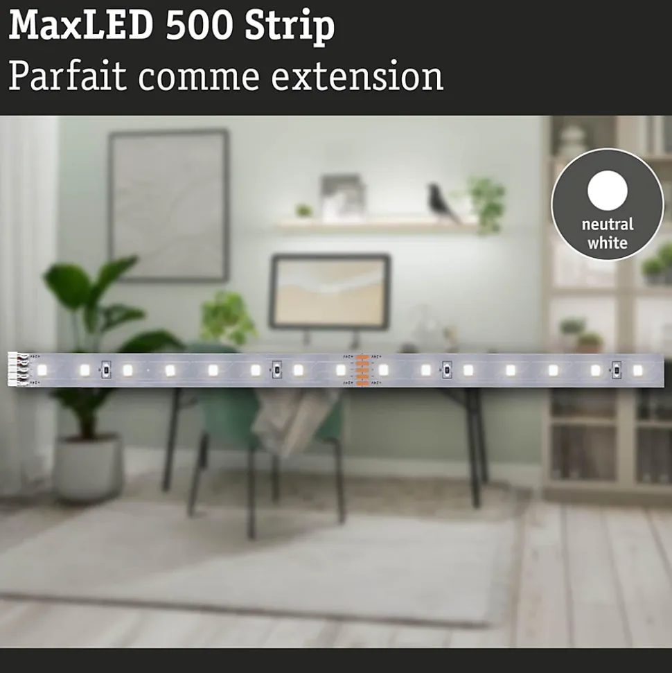 Le Strip LED MaxLED 500 blanc neutre est le choix idéal pour une solution d’éclairage moderne et particulièrement efficace en termes d’énergie. Par rapport aux luminaires traditionnels, le Strip LED consomme 40 % d’énergie en moins pour le même rendement lumineux. Le Strip convient parfaitement à l’utilisation dans les profilés et, avec une température de couleur de 4000 K, il fournit une lumière propice au travail blanc neutre et non éblouissante. À tout moment, vous pouvez créer l’ambiance lumineuse souhaitée en atténuant la luminosité de manière flexible. Le Strip est facile à raccourcir à l’aide de ciseaux et il s’adapte ainsi facilement aux conditions propres à votre pièce. Comme le Strip est facile à fixer aux meubles, aux étagères ou aux murs, de nombreuses options de décoration s’offrent à vous.