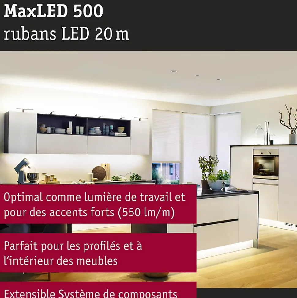 Les strips MaxLED sont si puissants qu’ils peuvent être utilisés sans problème comme éclairage d’intérieur. Ils sont particulièrement impressionnants dans les profilés. Les strips blanc chaud délivrent un éclairage d’ambiance et fonctionnel agréable et relaxant. En raison de sa longueur de 20m, ce strip est optimal pour la mise en valeur du mobilier ou pour des projets plus importants. Il est tout à fait possible de relier plusieurs strips entre eux à l’aide des trois câbles adaptateurs fournis.