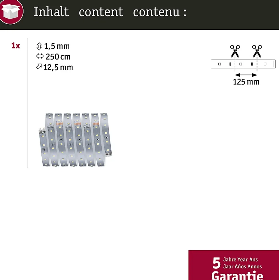 Le Strip LED MaxLED 500 blanc neutre est le choix idéal pour une solution d’éclairage moderne et particulièrement efficace en termes d’énergie. Par rapport aux luminaires traditionnels, le Strip LED consomme 40 % d’énergie en moins pour le même rendement lumineux. Le Strip convient parfaitement à l’utilisation dans les profilés et, avec une température de couleur de 4000 K, il fournit une lumière propice au travail blanc neutre et non éblouissante. À tout moment, vous pouvez créer l’ambiance lumineuse souhaitée en atténuant la luminosité de manière flexible. Le Strip est facile à raccourcir à l’aide de ciseaux et il s’adapte ainsi facilement aux conditions propres à votre pièce. Comme le Strip est facile à fixer aux meubles, aux étagères ou aux murs, de nombreuses options de décoration s’offrent à vous.