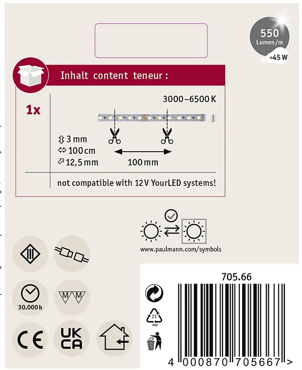 Avec commande de la lumière blanche (Tunable White)|Température de couleur : 3000 K – blanc chaud jusqu’à 6500 – blanc lumière du jour|Contrôlable via Bluetooth 4.0 et supérieur, par smartphone et tablette.|Peut être raccourci en fonction de la longueur souhaitée|Pas d’effet memory pour séparation 230 V (interrupteur)|Montage simple par système de connexion
