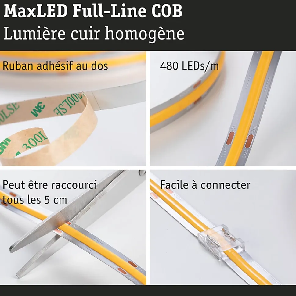 Pour extension des kits de base MaxLED|lumière homogène|Température de couleur: 2700K – Blanc chaud|Peut être raccourci en fonction de la longueur souhaitée|Le revêtement protège contre l’aspersion et la poussière.|Face arrière autocollante pour un montage simple|Matériel flexible pour le montage sur des surfaces planes ou courbes|Montage simple par système de connexion