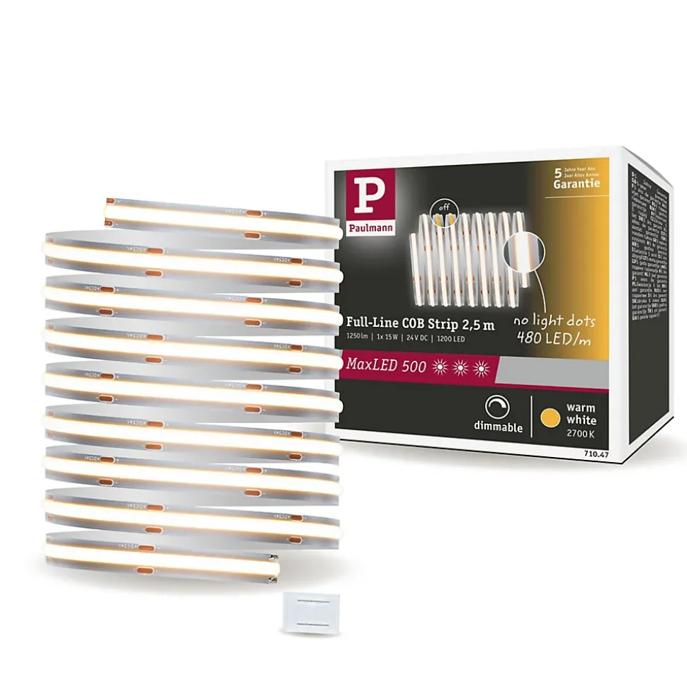 Que ce soit pour le plan de travail dans la cuisine ou pour d’autres surfaces de travail, les Strips MaxLED 500 Full-Line COB conviennent à merveille comme éclairage de travail non éblouissant. Le strip individuel MaxLED 500 COB avec 480 LED/m produit un rayonnement absolument homogène sans points lumineux visibles. Ce strip individuel blanc chaud sert d’extension pour le kit de base MaxLED 500 COB. Outre les bandes, il contient un connecteur lumineux. Le connecteur lumineux permet une connexion parfaite qui prolonge le visuel lumineux linéaire sans interruption visible. Le Strip de 10 mm est particulièrement étroit et se glisse donc facilement dans les profilés LED filigranes. L’angle de rayonnement large de 180° répartit la lumière à merveille sans ombre portée. Une couche continue de phosphore protège les LED de la poussière et de l’humidité, les points de contact ont l’IP20.