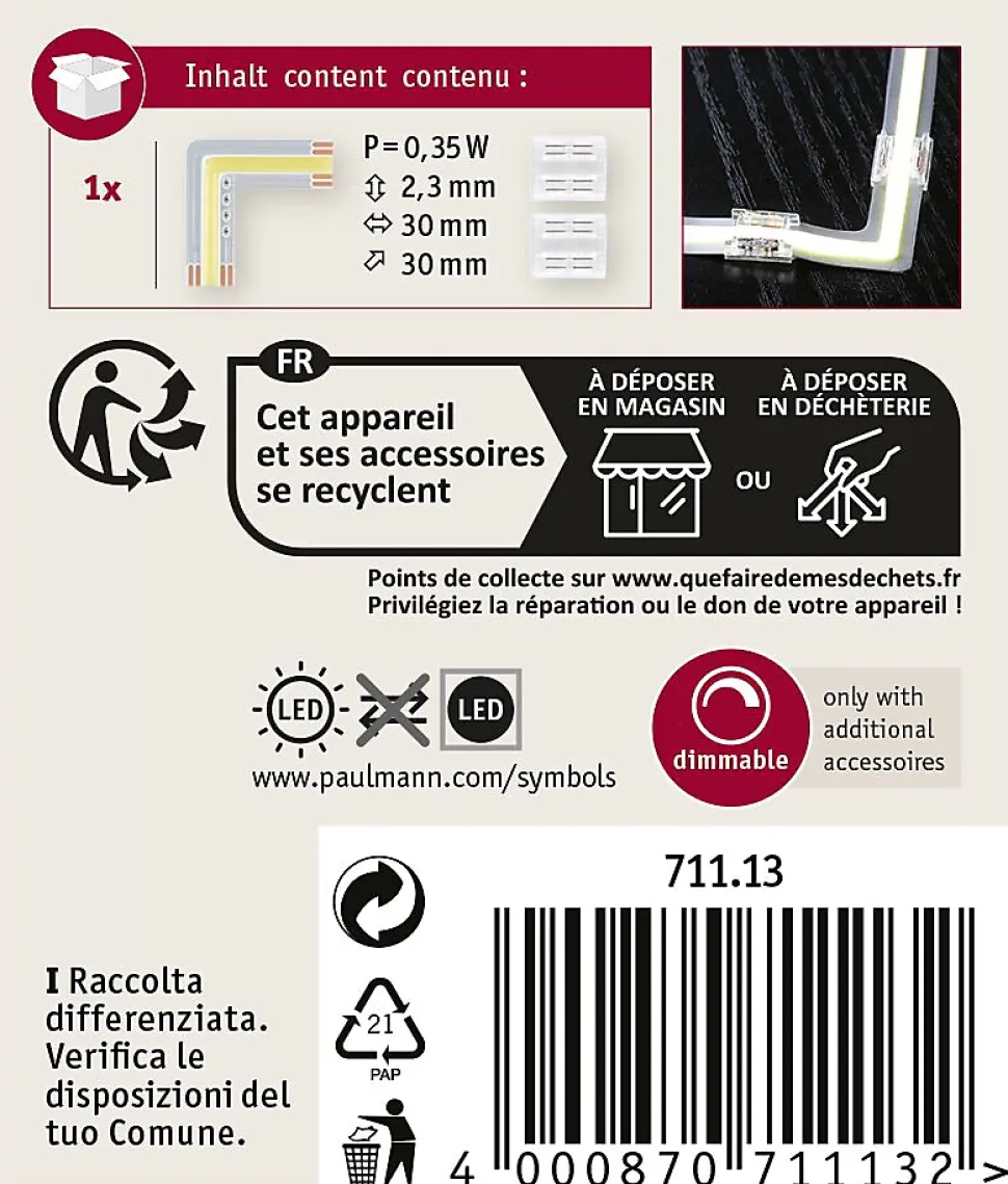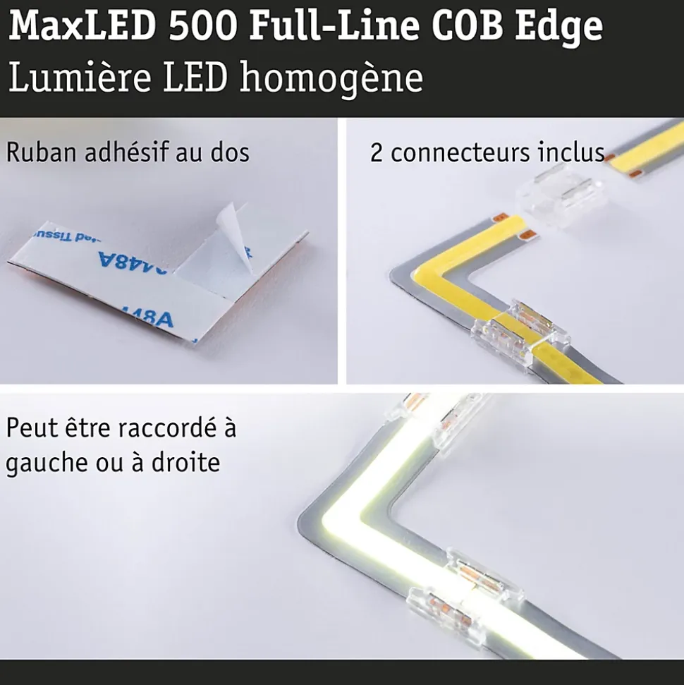 Les angles MaxLED 500 Edge Full-Line COB sont le complément parfait d’un concept d’éclairage MaxLED 500 Full-Line COB requérant une pose coudée. Les angles COB des strips avec commande de la lumière blanche Tunable White permettent de les déplacer à 90° sans interrompre leur halo lumineux. Chaque angle est livré avec deux connecteurs lumineux pour le raccordement. L’angle peut être raccordé de manière universelle dans les deux sens, à gauche ou à droite. Plan de travail de cuisine, atelier ou autres surfaces, les strips MaxLED 500 Full-Line COB sont si puissants qu’ils peuvent être utilisés sans problème comme éclairage d’intérieur.