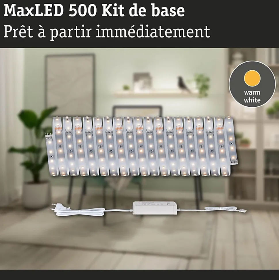 Kit complet avec Strip et alimentation|Strip LED à haute efficacité 40 % d’énergie en moins pour le même rendement lumineux|Température de couleur: 2700K – Blanc chaud|Peut être raccourci en fonction de la longueur souhaitée|Face arrière autocollante pour un montage simple|Gradable avec le contrôleur variateur/commutateur MaxLED|Aménagements personnalisés|Montage simple par système de connexion