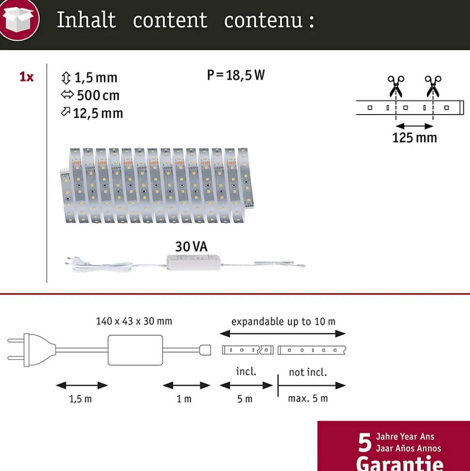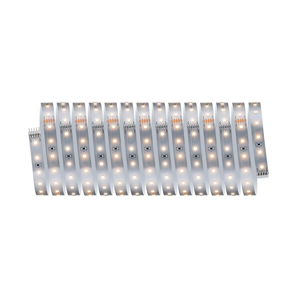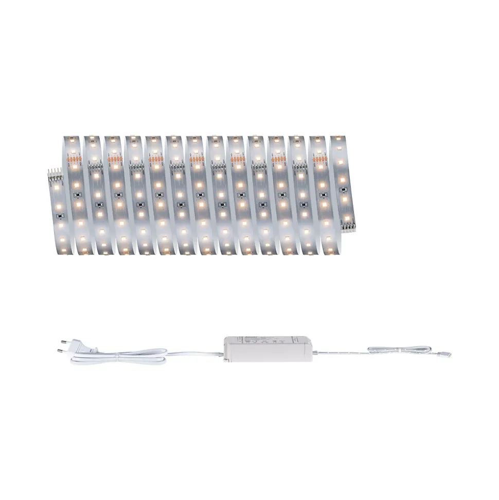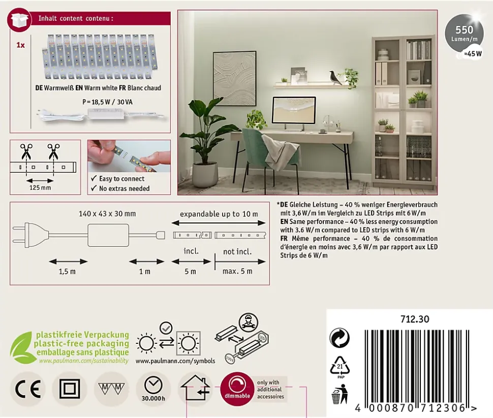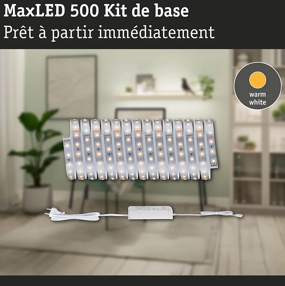 Kit complet avec Strip et alimentation|Strip LED à haute efficacité 40 % d’énergie en moins pour le même rendement lumineux|Température de couleur: 2700K – Blanc chaud|Peut être raccourci en fonction de la longueur souhaitée|Face arrière autocollante pour un montage simple|Gradable avec le contrôleur variateur/commutateur MaxLED|Aménagements personnalisés|Montage simple par système de connexion