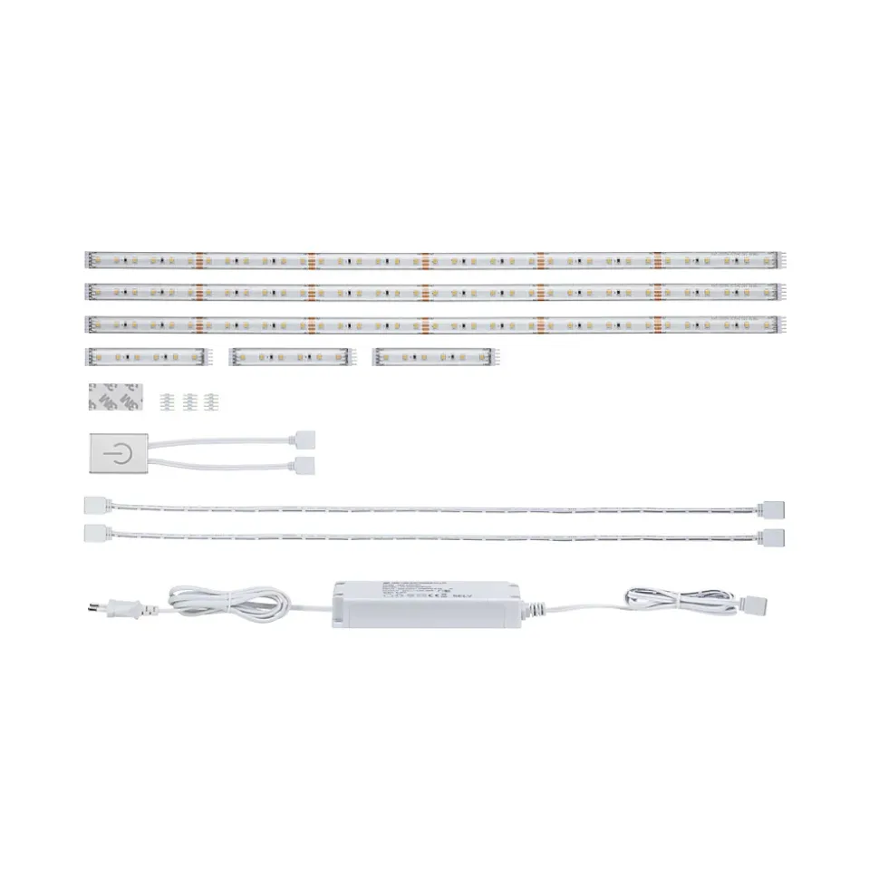 Le kit offre un excellent éclairage de travail sous l’élément suspendu. Les trois strips à revêtement sont conçus pour 3 éléments de 60 cm d’armoire-penderie. Si cela ne convient pas, les strips peuvent être réduits tous les 8 cm ou étendus jusqu’à 3 m avec des strips supplémentaires. Le kit contient un long câble d’alimentation et deux câbles supplémentaires qui permettent une installation derrière une hotte aspirante. Avec le commutateur Touch discret, variateur inclus, allumez et éteignez directement l’éclairage au niveau du sous-meuble. Un simple contact sur l’élégant boîtier en métal permet d’actionner l’interrupteur ; variez l’intensité avec un appui long.