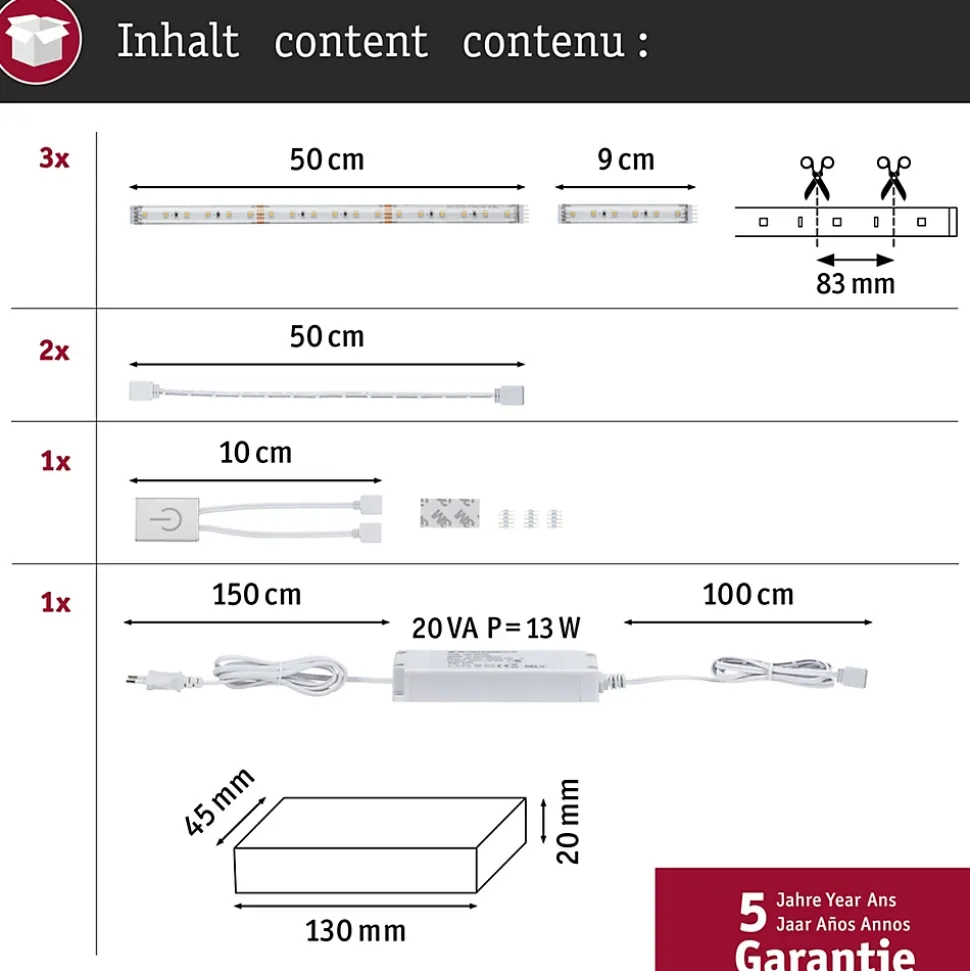 - Coupable et extensible – peut être coupé tous les 8 cm ou étendu jusqu’à 3 m avec une bande supplémentaire.