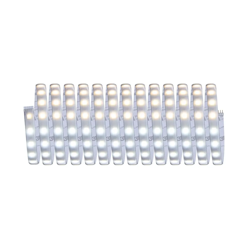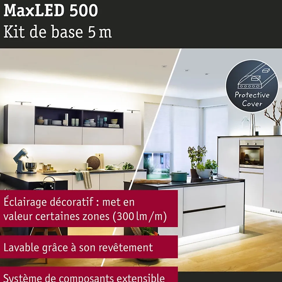 Avec 26 watts, les Strips MaxLED 500 sont si puissants qu’ils peuvent être utilisés sans problème comme éclairage d’intérieur. Intégrant la fonction Zigbee 3.0, ils séduisent par leur fonctionnement intelligent. Grâce à la commande de la lumière blanche intelligente Tunable White, vous pouvez personnaliser la température de couleur du strip d’un blanc lumière du jour en guise d’éclairage de travail à un blanc chaud plus propice à la relaxation. Outre le ruban avec revêtement (Protect Cover) d’une longueur de 5 m, le kit de base contient un ballast adapté et un Controller Zigbee 3.0 qui permet une commande intelligente. Une télécommande ou une passerelle pour la commande intelligente ne sont pas comprises dans ce set de base. Zigbee 3.0 est un protocole de transmission radio qui met en réseau les appareils de différents fabricants. Le ballast contient une réserve de performance supplémentaire, ce qui permet le cas échéant de pouvoir le prolonger avec d’autres Strips. Les Strips MaxLED sont particulièrement impressionnants dans les profilés. Paulmann propose en outre une gamme fournie de profilés encastrés ou en saillie assortis aux Strips MaxLED.