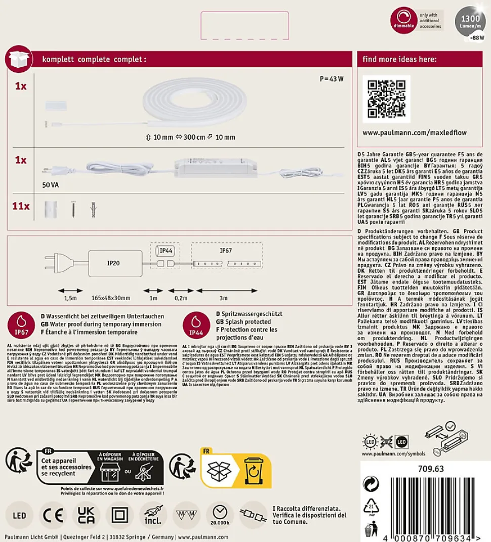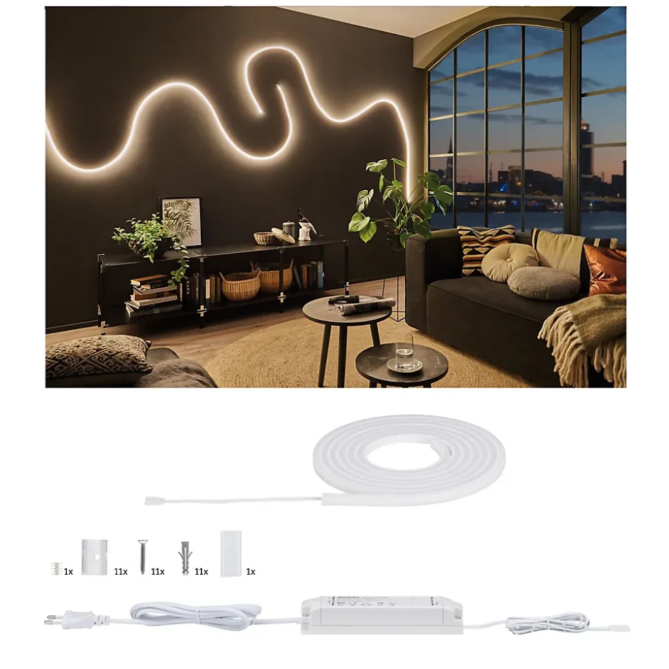 Subtil, homogène et puissant ! Avec sa puissance de 37 watts, MaxLED Flow diffuse une lumière étendue sans points LED visibles. Il est enrobé d’un profilé flexible, possède un angle de rayonnement spectaculaire et peut être posé de manière rectiligne ou en épousant des courbes. Le set comprend des clips de montage transparents quasi invisibles, ainsi que des vis et des douilles de fixation. Doté de la protection IP67, ce Strip filigrane convient aux pièces humides et vient illuminer votre salle de bain Wellness.