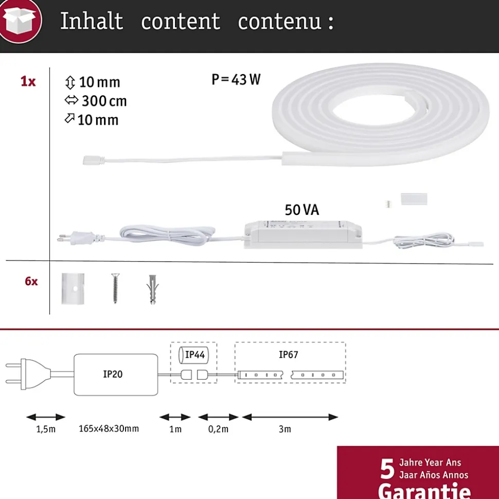 Ruban lumineux homogène et régulier sans points lumineux dérangeants.|Kit complet avec ruban et alimentation|Kit non extensible|Clips de support pour fixation inclus|Peut être raccourci en fonction de la longueur souhaitée